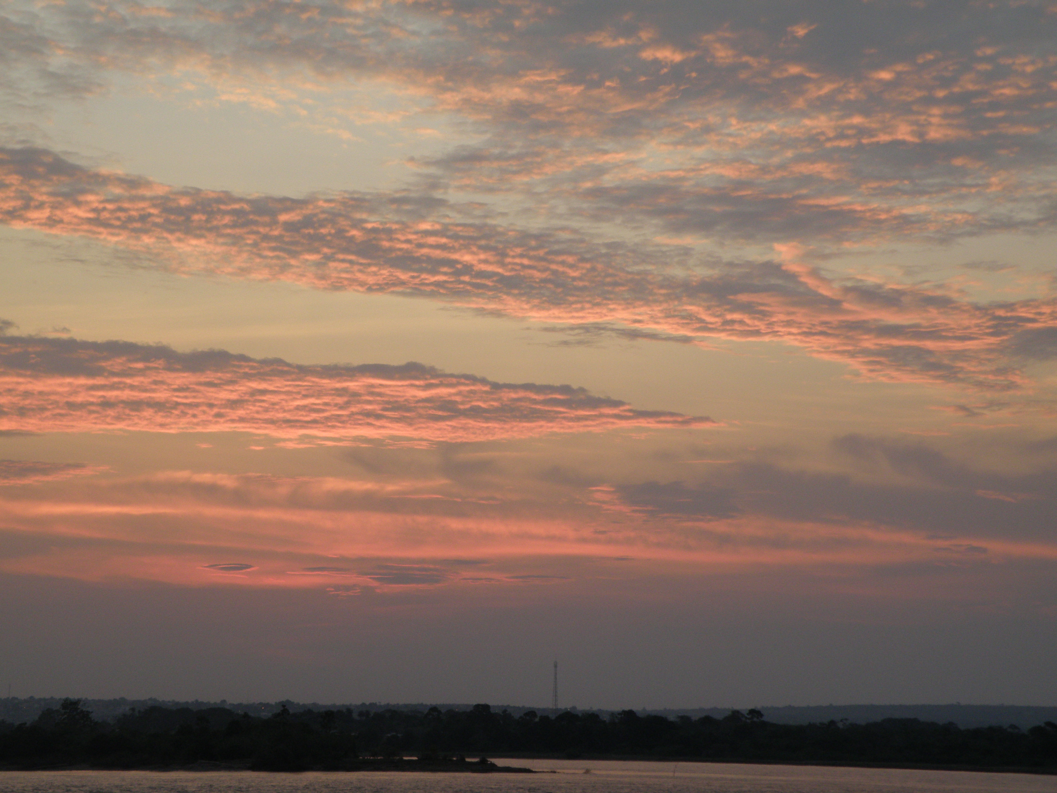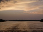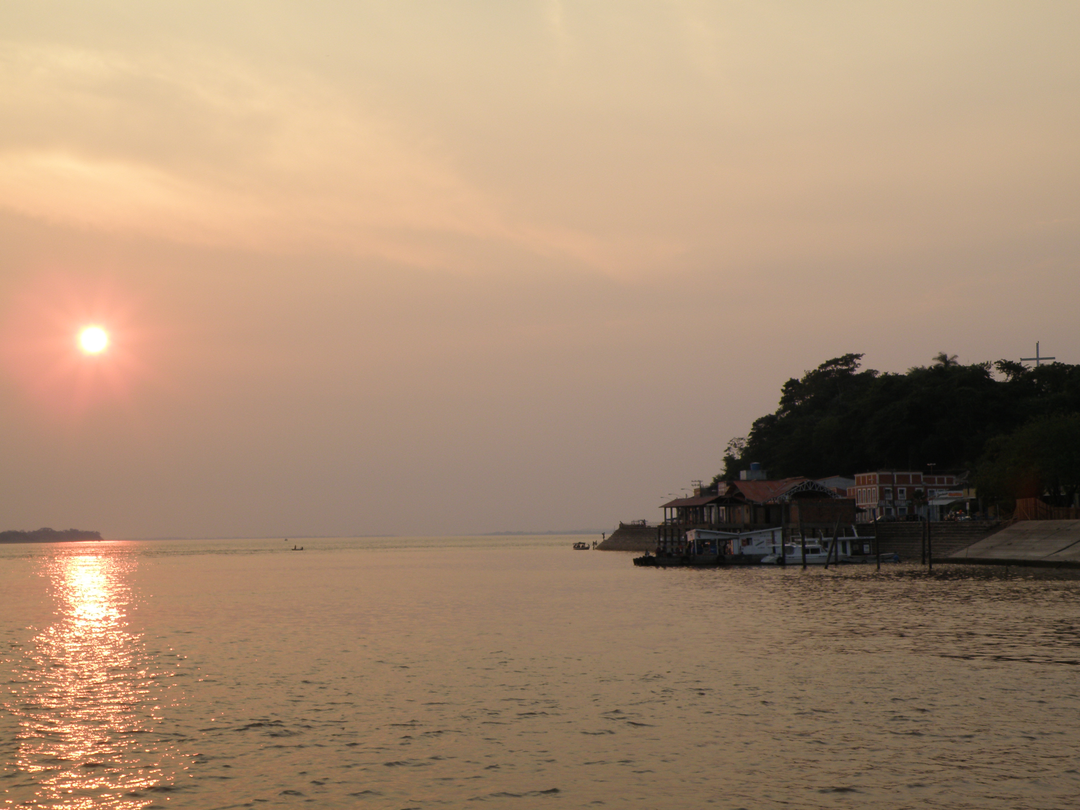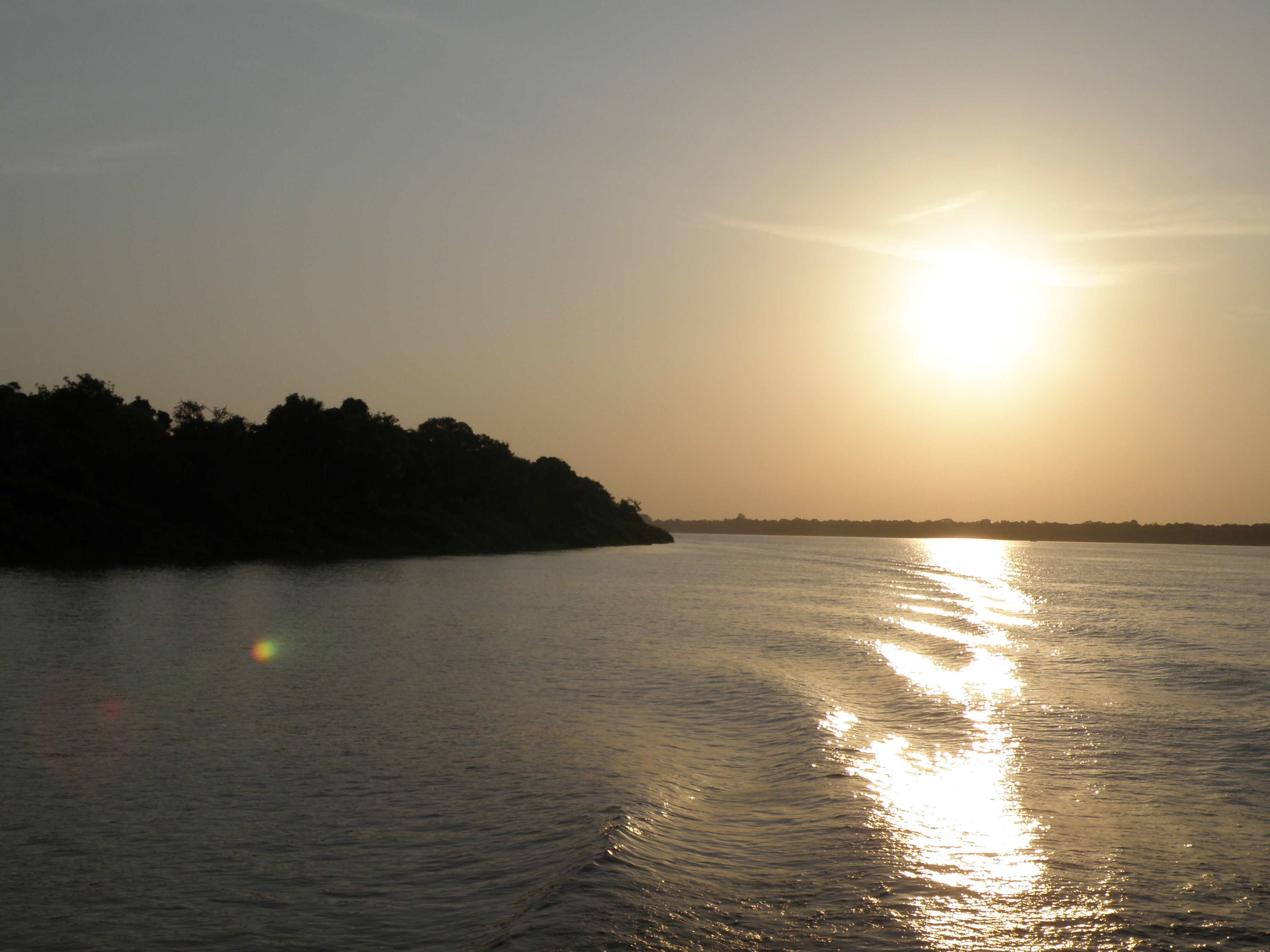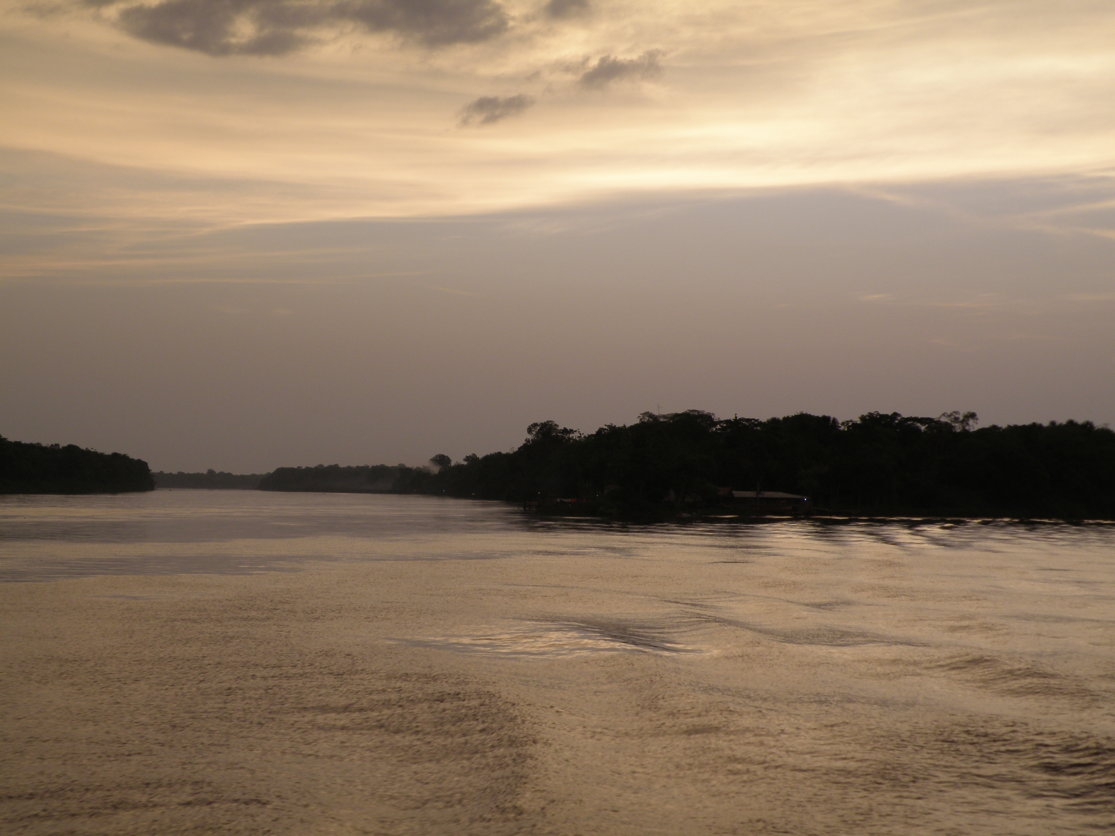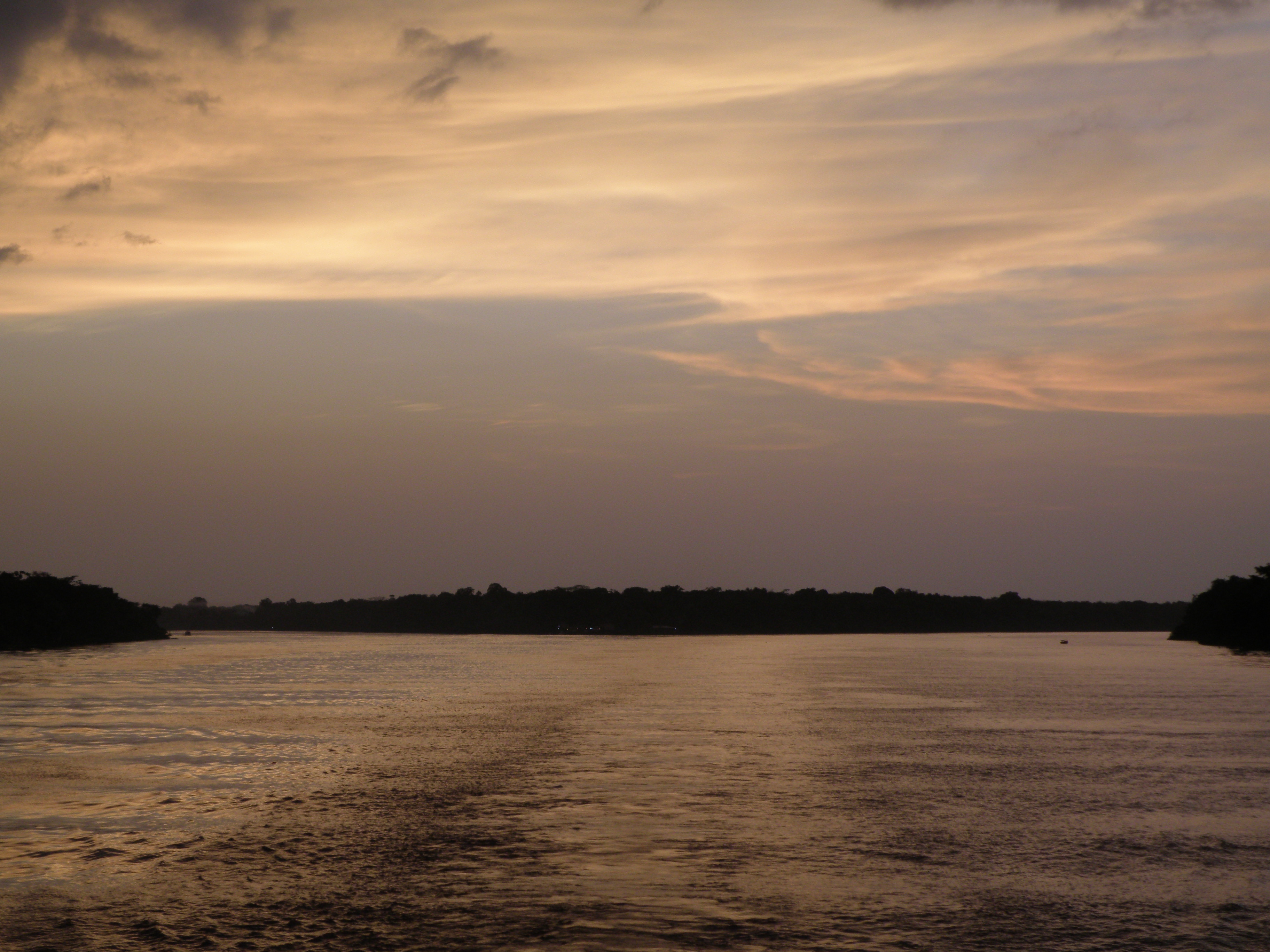 Before dinner there was a huge commotion. An alligator suddenly popped its head out of the choppy waters beside the boat. The large reptile, in its motionless state, vanished as suddenly as it had surfaced. I had a thick meat and vegetable soup for dinner. Tiago and Helena continued to stay on board. They were looking rather sheepish in case the crew clocked them. I continued reading Wild Swans, a very powerful and true story. The heart-breaking and painful recollections of life during China’s Cultural Revolution were harrowing. Later in the afternoon, we approached a narrower channel of the Amazon. The surrounding jungle came into closer view. Many passengers climbed up the steps to the top deck to admire a stunning sunset. There were even less hammocks following an early evening port of call where riverside workers busily loaded the bottom deck with melons and coconuts.