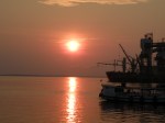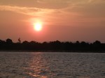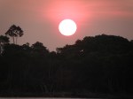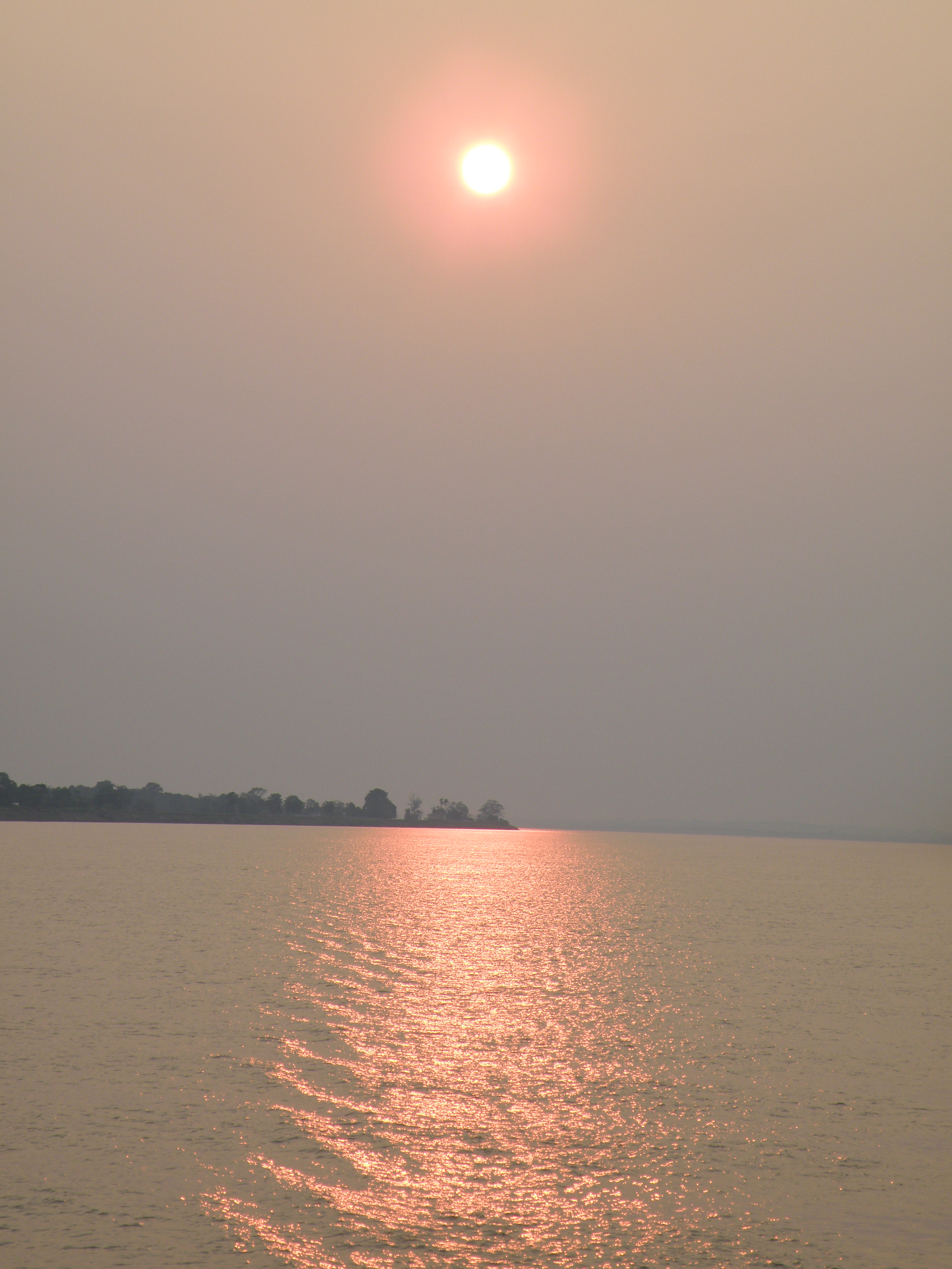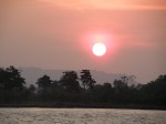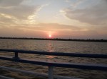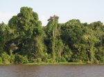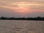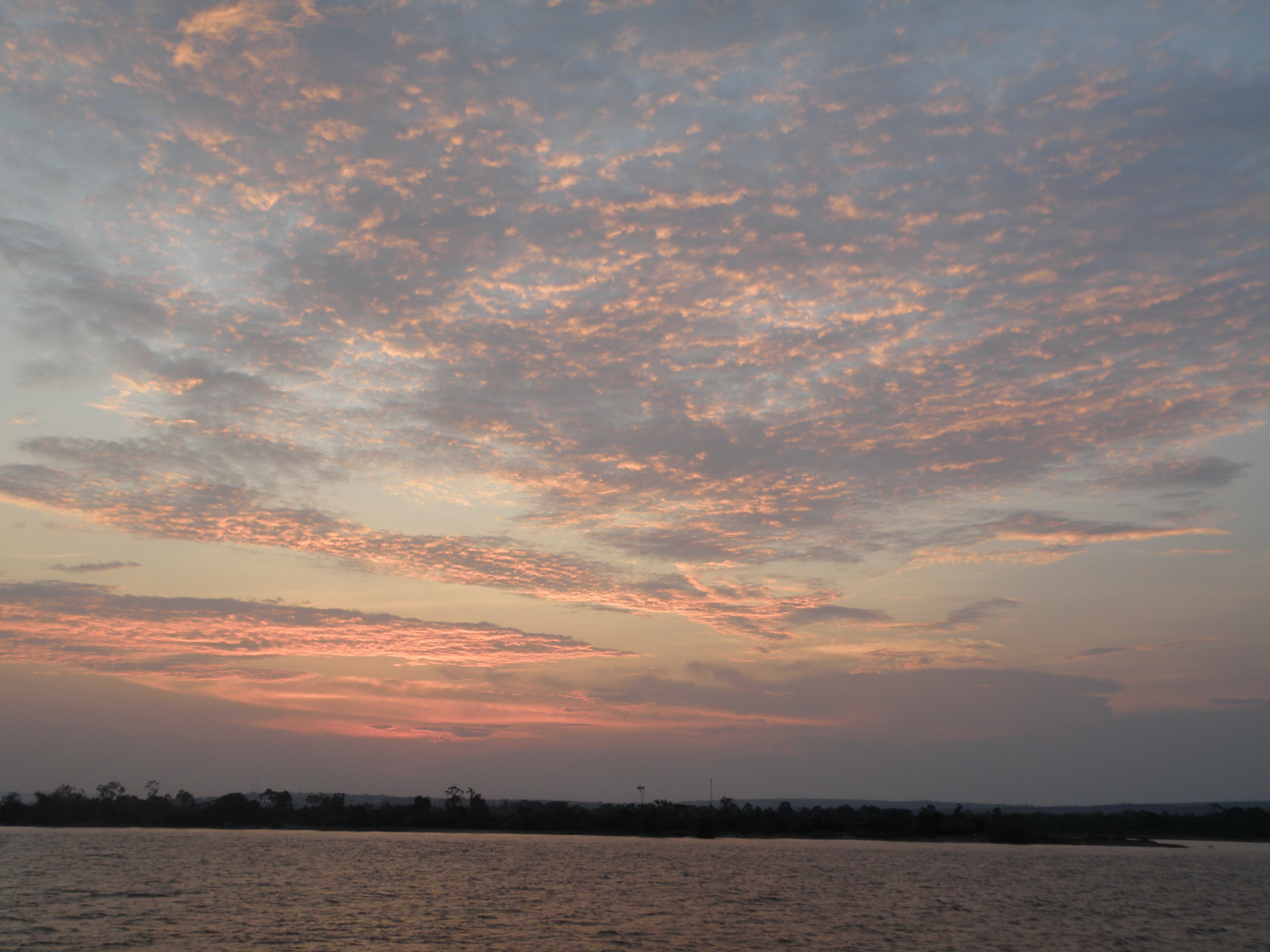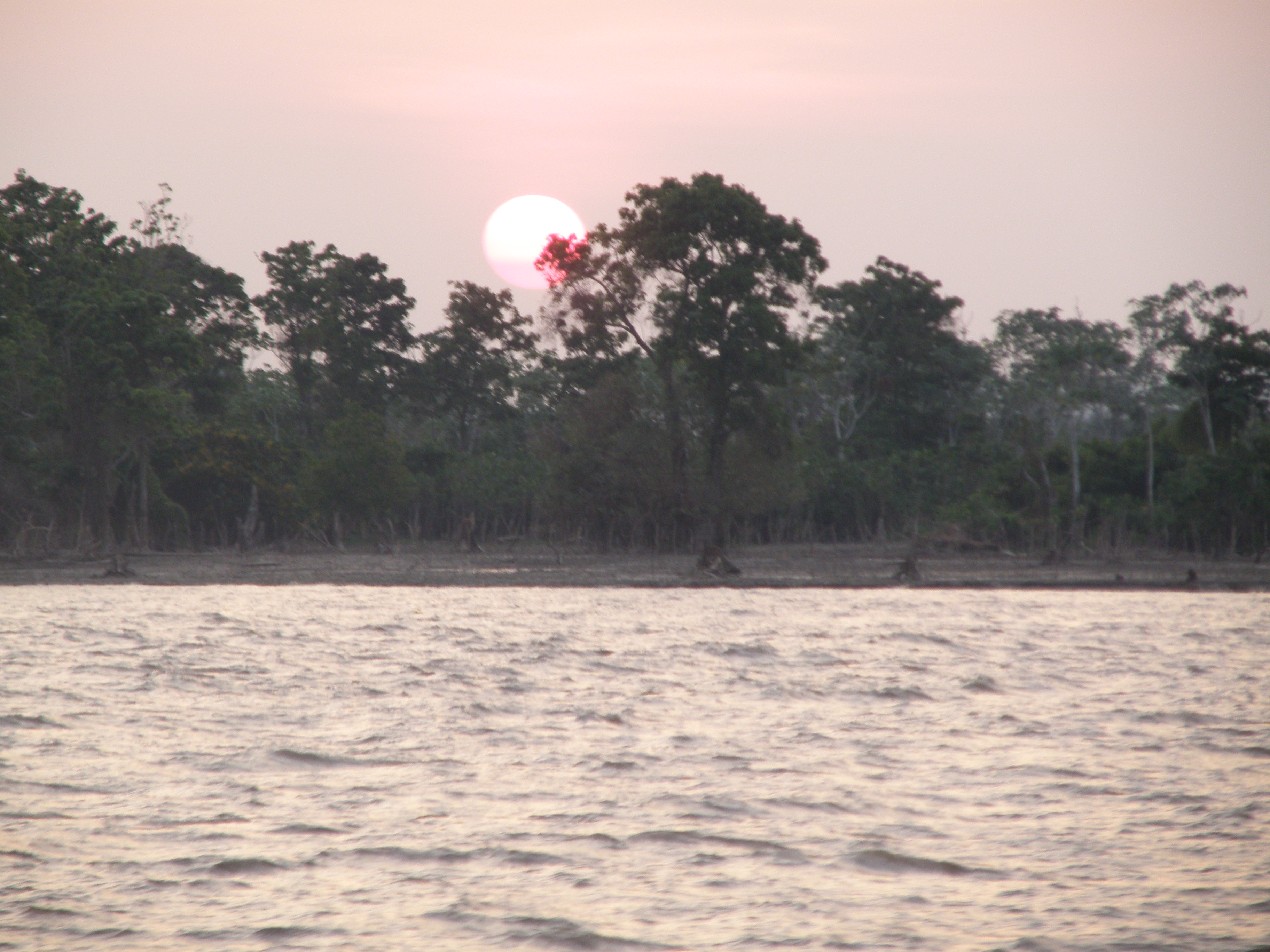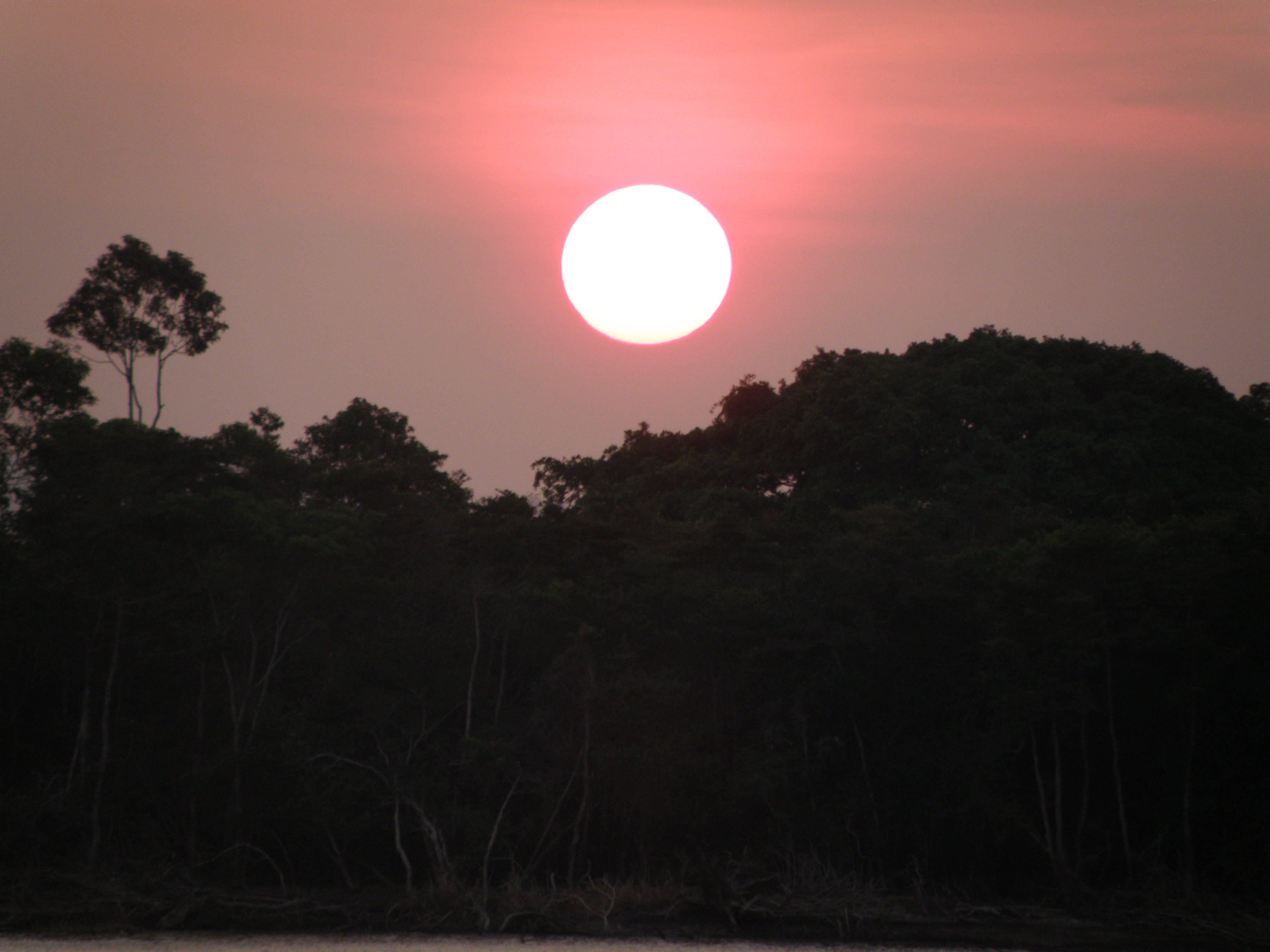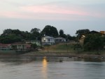 Before dinner there was a huge commotion. An alligator suddenly popped its head out of the choppy waters beside the boat. The large reptile, in its motionless state, vanished as suddenly as it had surfaced. I had a thick meat and vegetable soup for dinner. Tiago and Helena continued to stay on board. They were looking rather sheepish in case the crew clocked them. I continued reading Wild Swans, a very powerful and true story. The heart-breaking and painful recollections of life during China’s Cultural Revolution were harrowing. Later in the afternoon, we approached a narrower channel of the Amazon. The surrounding jungle came into closer view. Many passengers climbed up the steps to the top deck to admire a stunning sunset. There were even less hammocks following an early evening port of call where riverside workers busily loaded the bottom deck with melons and coconuts.