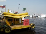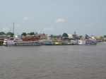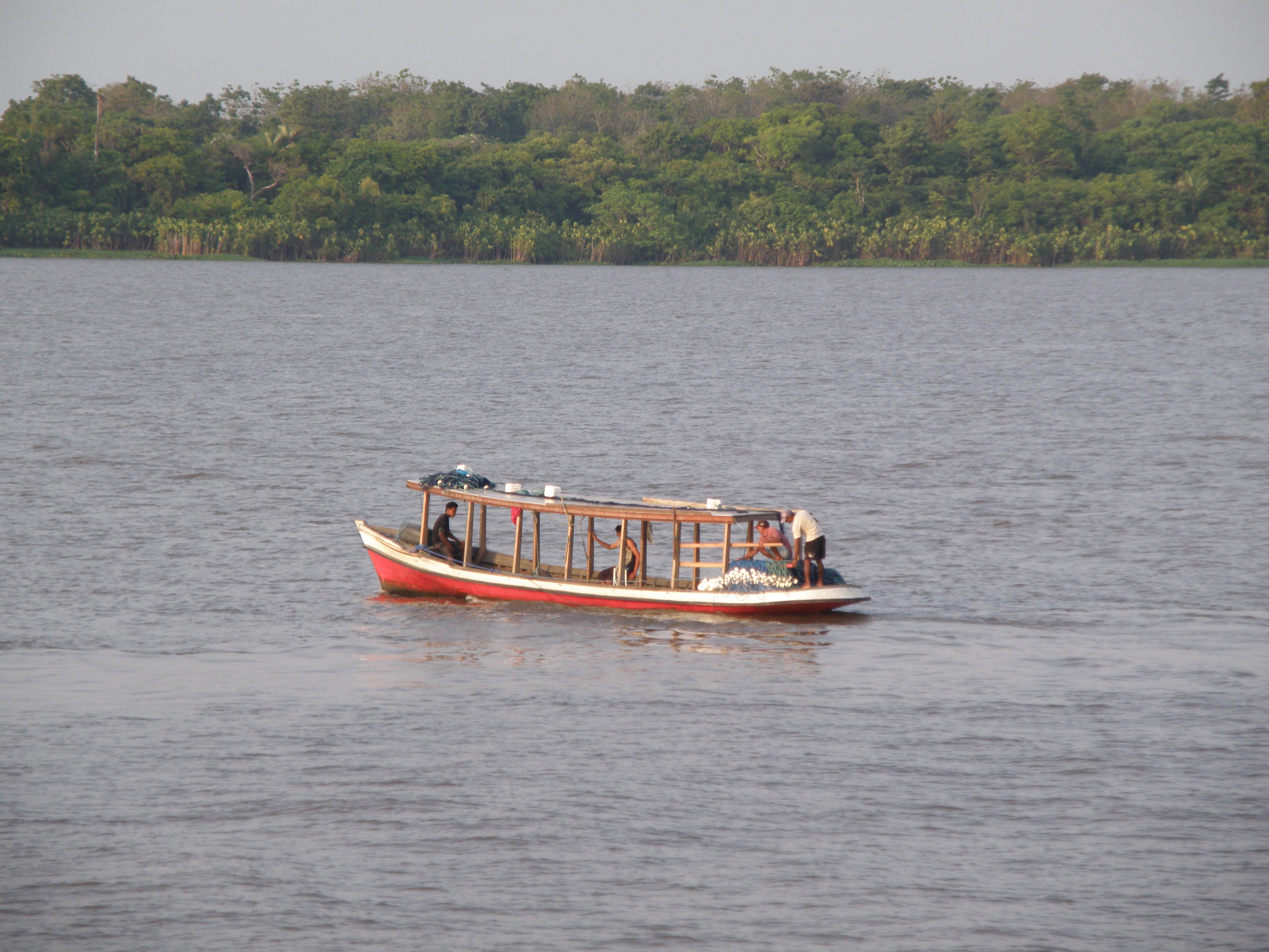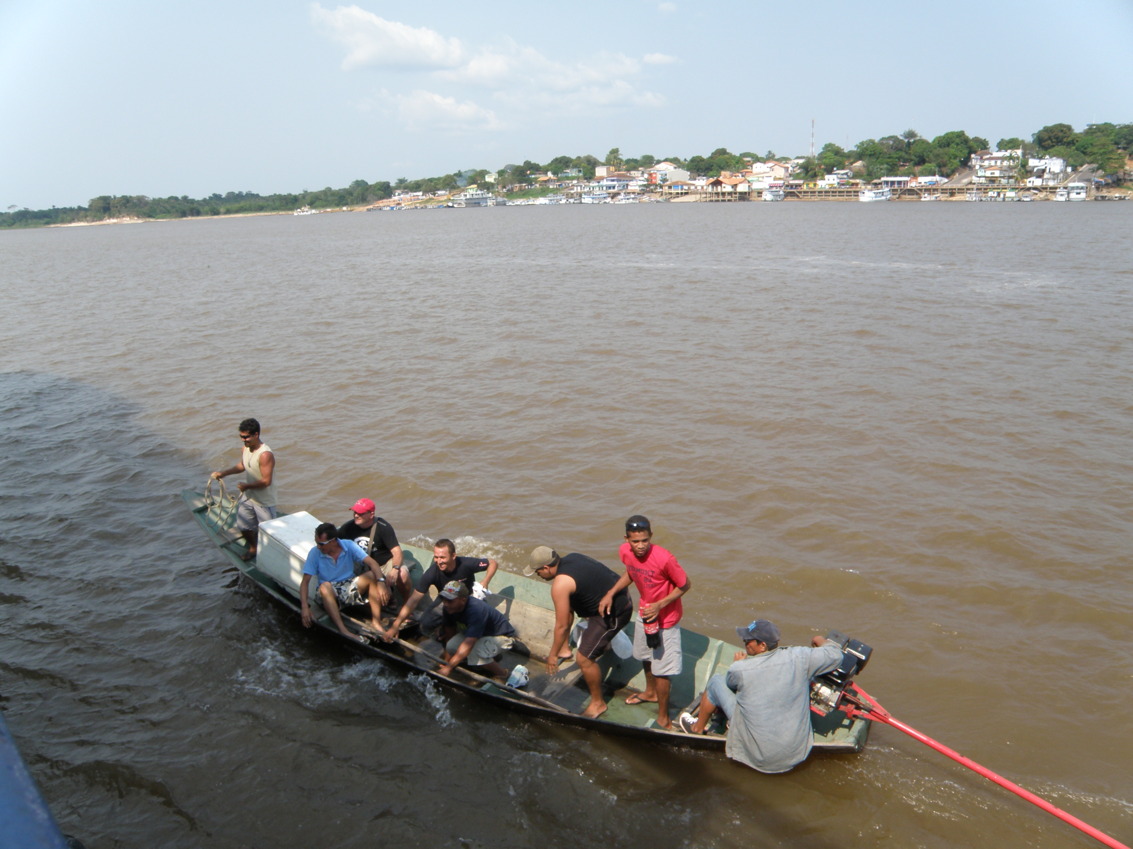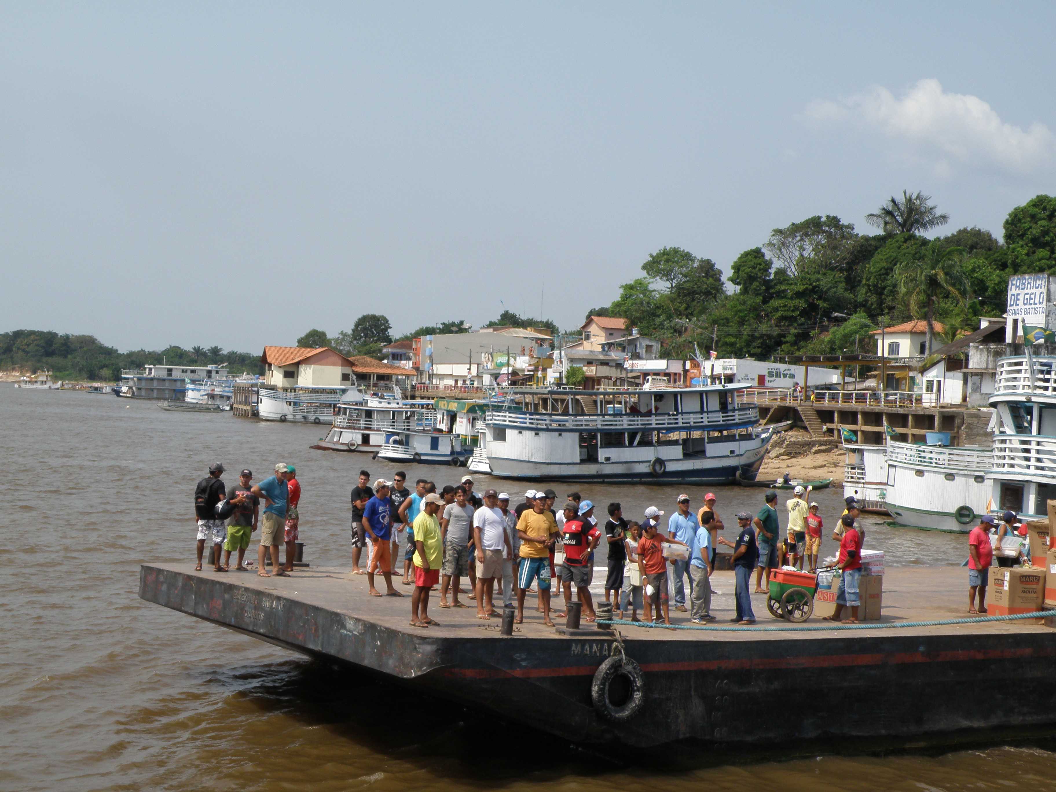 My backpack and guitar were secured to a pillar beside my hammock. There was little room to move around on the middle deck until a few of the passengers disembarked on stops further down river. The boat docked at Porto de Parintins as the morning heated up into a steamy day. Strong sunshine sent a silver like reflection onto the river. Vendors boarded the boat to sell refreshments. A couple of the regular drinkers on the top deck went ashore to stock up on rum. They were nearly caught out when we left the port without them, but a locally piloted speedboat brought them into the middle channel. They clambered back on board to lots of cheers.