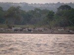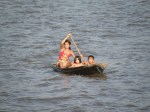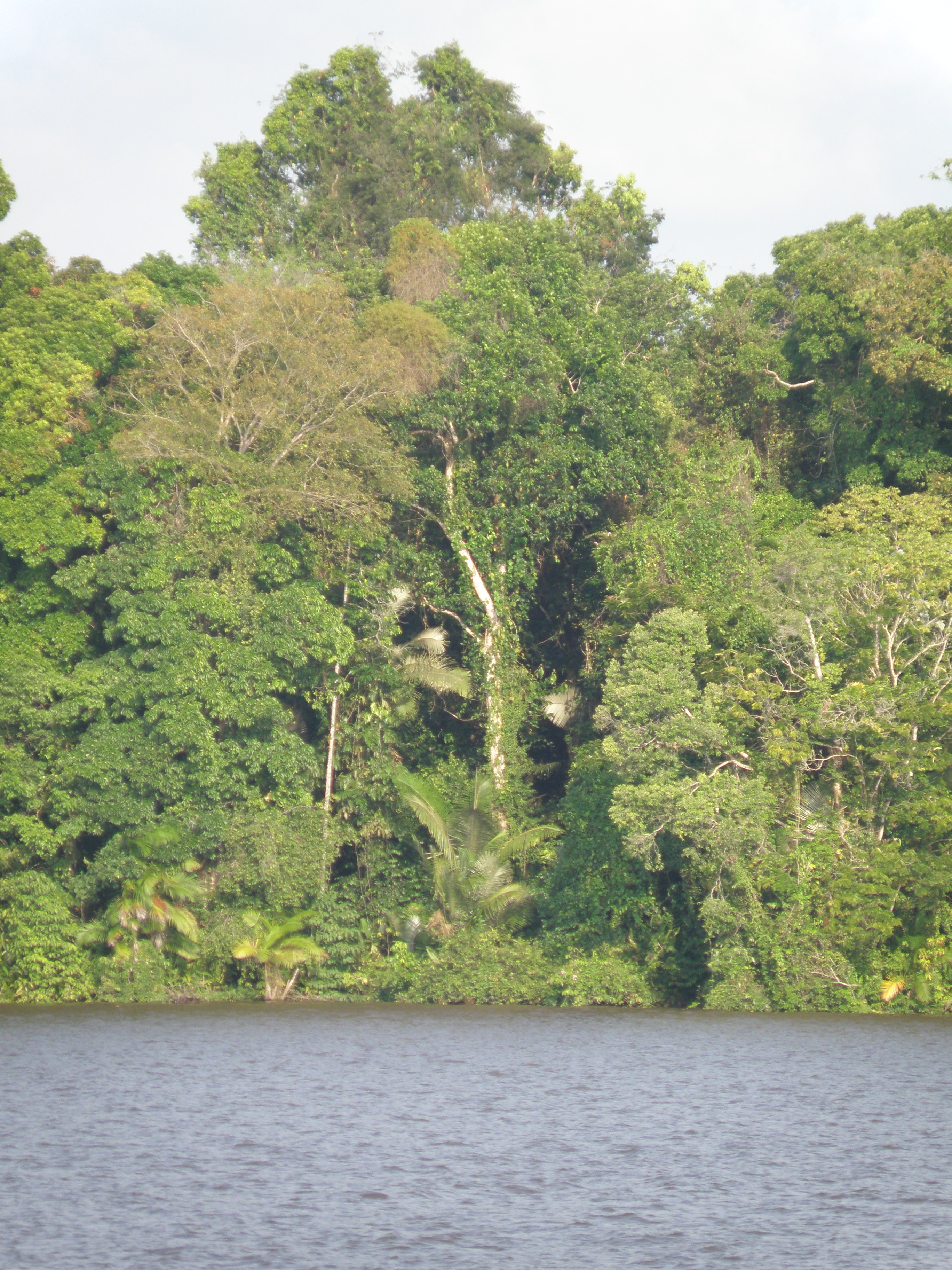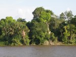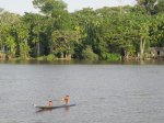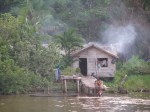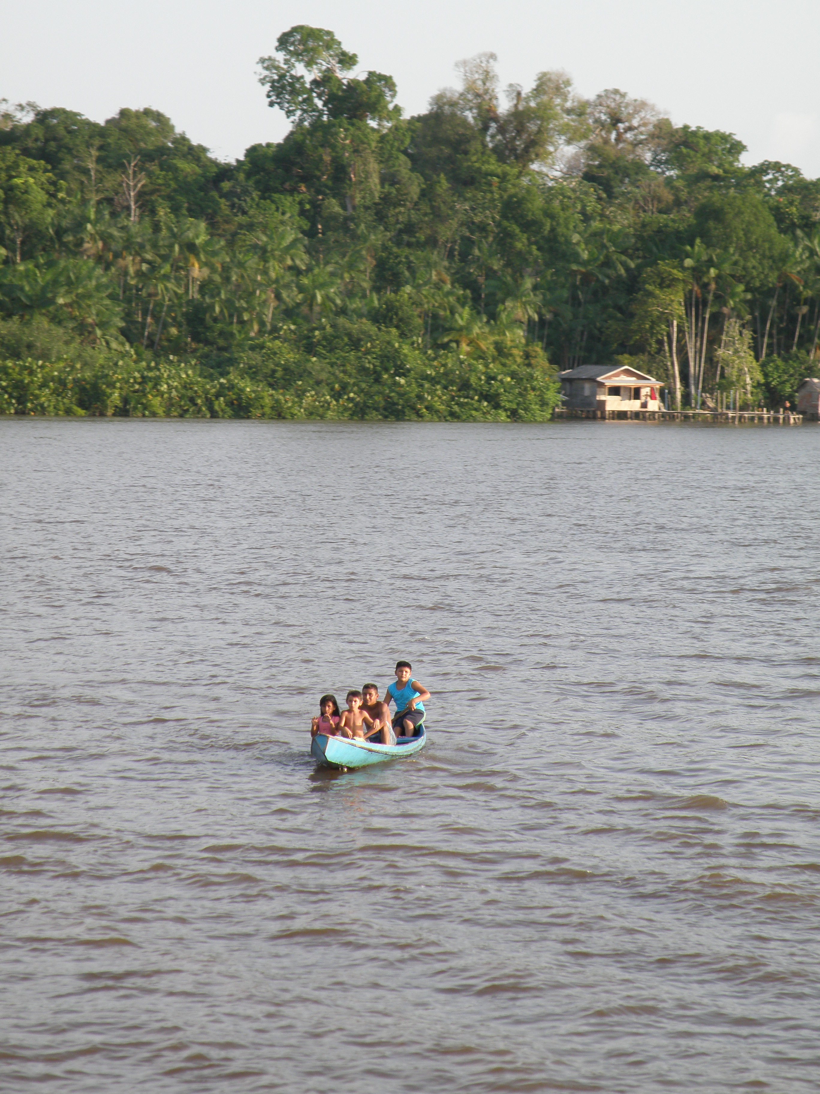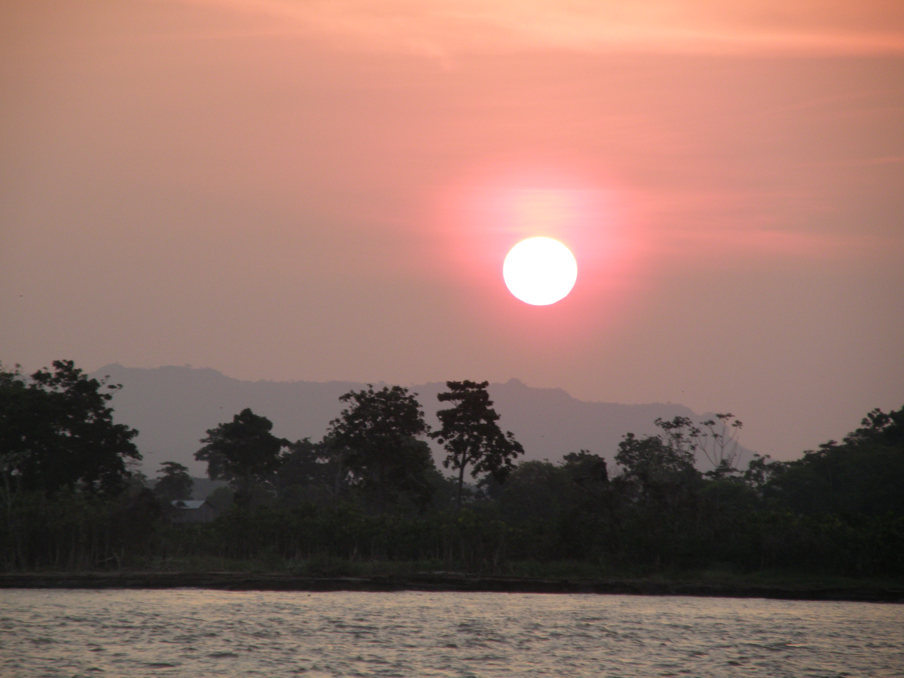 There were some fine tunes blaring out on the top deck. One song had a particularly euphoric movement to it. By late afternoon the boat arrived at a much narrower stretch of river. There were mothers and children rowing their boats out from their shoreline shanties in the deep, green jungle. They waved and called for clothing. Many sealed bags were thrown over to them in a ritualistic gesture of giving. I’d never seen so many happy, smiling faces all at once. They reflected a wondrous, sunset scene. An incredible storm brewed up after dark. Horizontal lightning and violent overhead thunder cracks shook our craft. The crew pulled down the side tarpaulins and the lights remained on all night. There was no danger. The storm later subsided, and the night became calm once again.