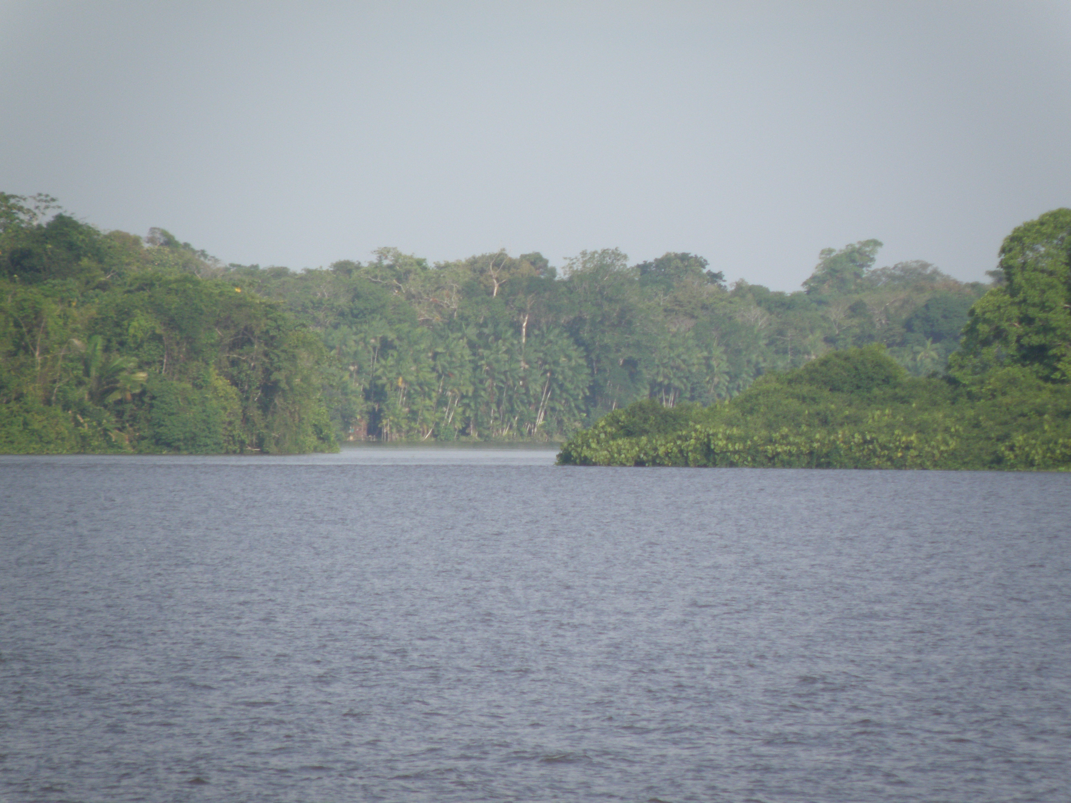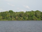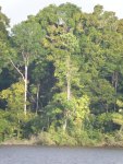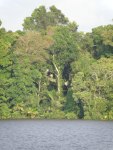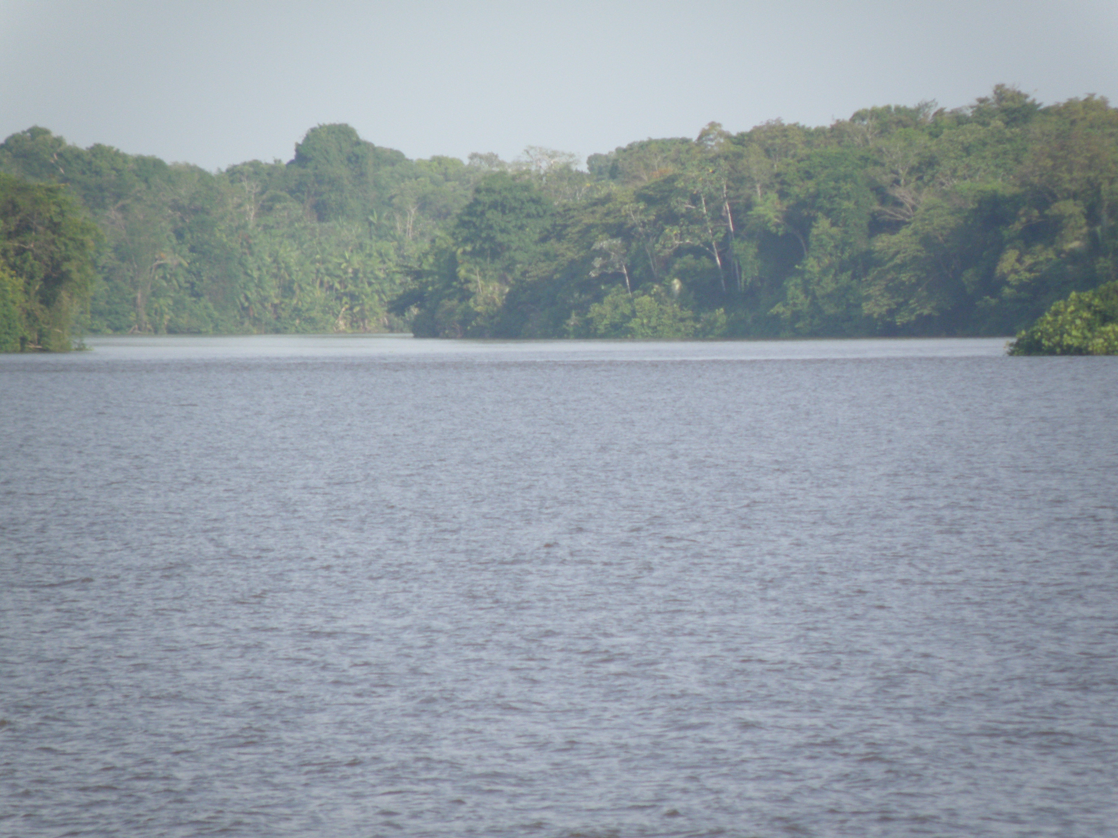 My little blue book of diary notes was full, so I continued scribbling stuff into my new notepad. We sailed further down the wide River Amazon. Clumps of twigs, grass and reeds plus other floating debris often appeared on the surface. The mid-channel passage afforded distant views of the wooded riverbank. Both the top and middle decks had chest high, narrow railings. Food was conveniently served on pull-out tables behind my hammock. Sweet coffee and bread were served for breakfast.