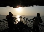 I spotted a shoal of porpoises swimming close to our craft as the sun went down. Apart from that, the murky expanse offered little other wildlife to admire. There was plenty of life on the top deck as the music continued. The drinks flowed and people began energetically dancing the night away. The dinner orders were also being taken by the bar staff. I enjoyed a ham and cheese toastie and got talking to Jordan, one of a group of guys from Vancouver.