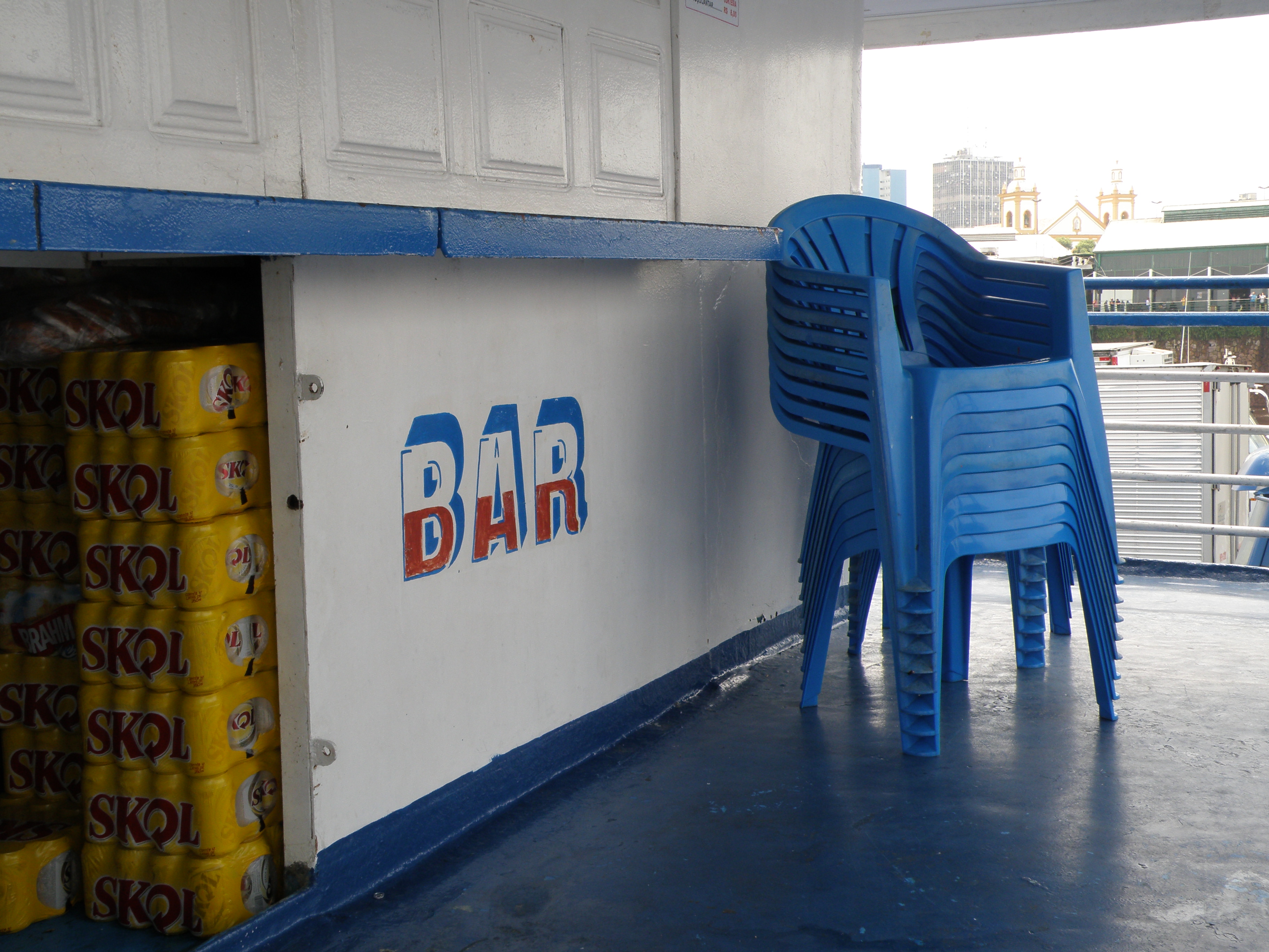 The boat quickly filled up with passengers, and dock workers loaded the lower deck with a cargo of bottled beer. The big boat, or small ship, left port. It then turned back a few hundred metres along the northern shore of Manaus. We waited a further three hours to set sail east down into the River Amazon. More passengers and cargo came on board. Three blasts of the ship’s horns signalled its imminent departure. The middle deck hammocks were all a tangle and an eager noise increased. I briefly jumped out on to the concrete jetty to buy some more water and snacks. I quickly hopped back on board and climbed up to the top deck where the bar was being stocked with crates of Skol beer.