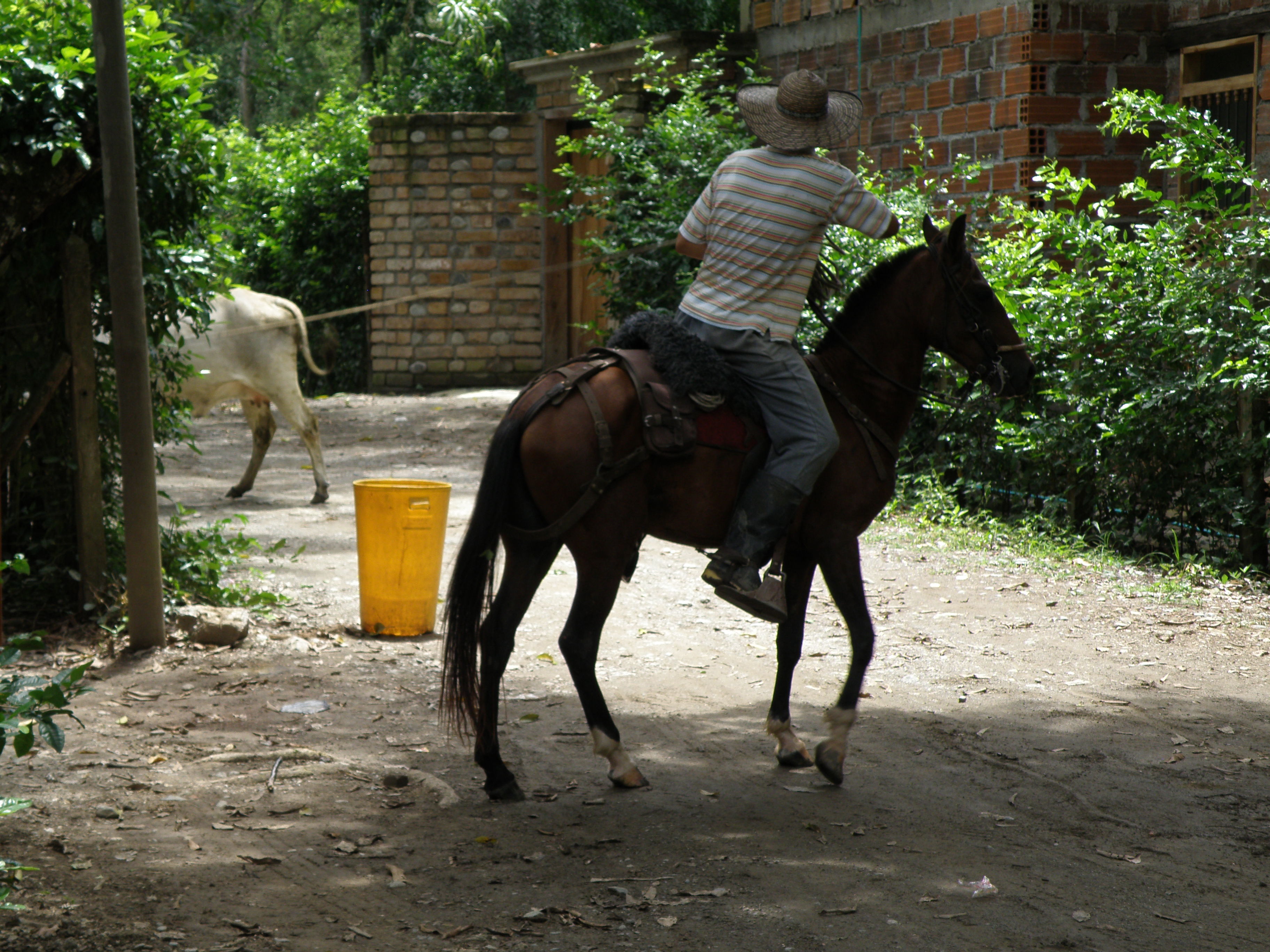 The Puente de Occidente was five kilometres east of Santa Fe. We ventured down a narrow side street and stopped at a small shop to ask a man if he could call for a taxi. This he gladly did for a couple of pesos. As we waited, a stray cow suddenly came charging down the street. A couple of men on horseback followed, desperately trying to subdue and guide the beast. It came closer, focussing its attention on us and stomping heavily on the dusty ground. I leapt back, pushing Jon against a wall, but fortunately the cow steered just past us in a state of wild confusion. We were lucky. Jon laughed and said such incidents just didn’t happen where he came from!