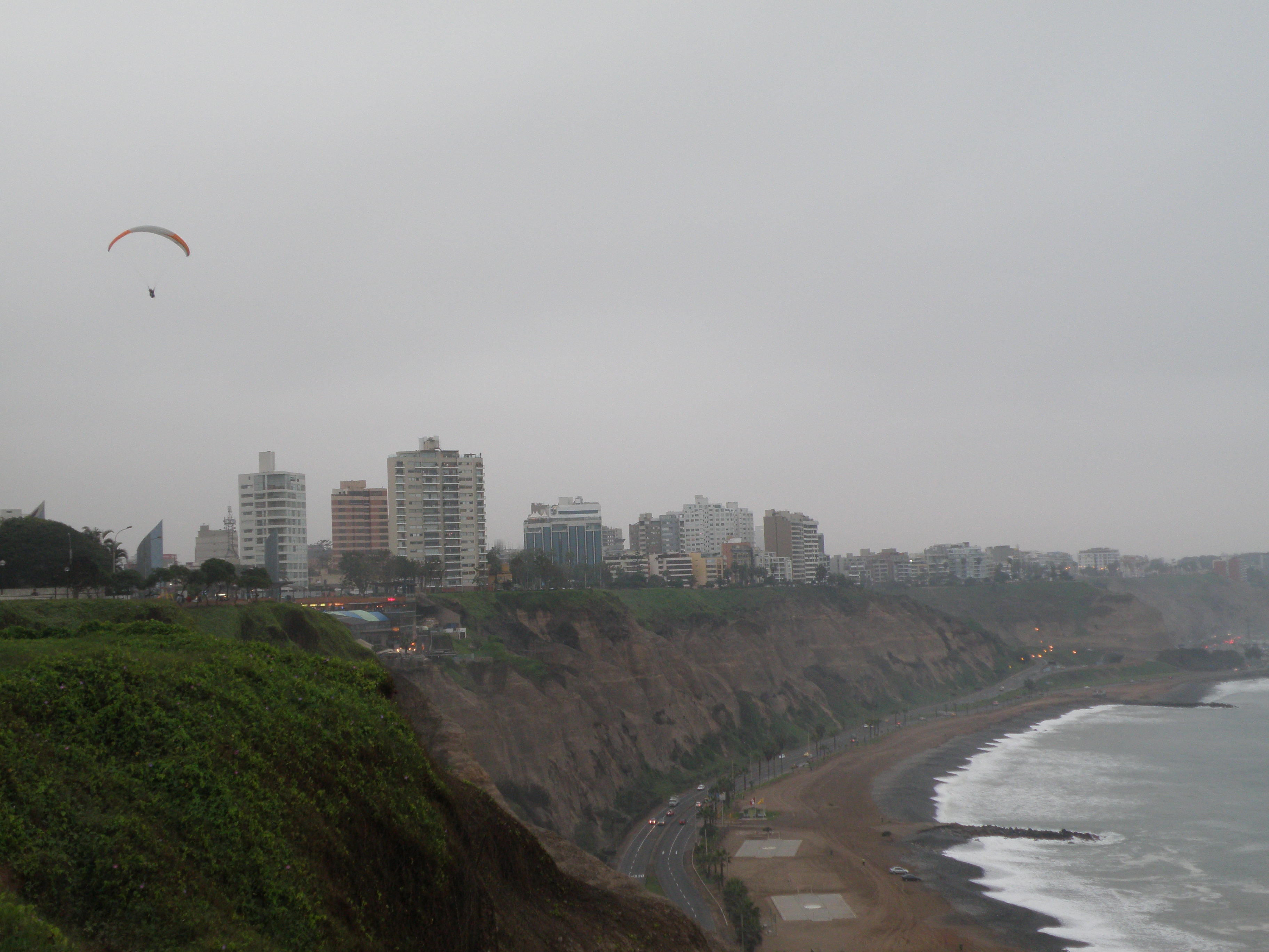 Germany continued their fine form in the World Cup. I watched them demolish another South American hope, this time Argentina. I had a day to enjoy before my night bus, so I took a little tour around Miraflores. It was another wet old dog smell of a day. Tiny puddles pooled on the pavements like someone had squeezed the last drops out of a damp jumper or shaken a wet cobweb. There was a translucent film of moist mist all around. I checked out the listings at Cine Planet, saw the ancient adobe pyramid at Huaca Pucllana and ate a hearty saltado lunch at Brisas del Mar. I enjoyed one last visit to the beachfront cliffs near the black and white lighthouse, the Faro La Marina. The paragliders were still floating against time as darkness fell.