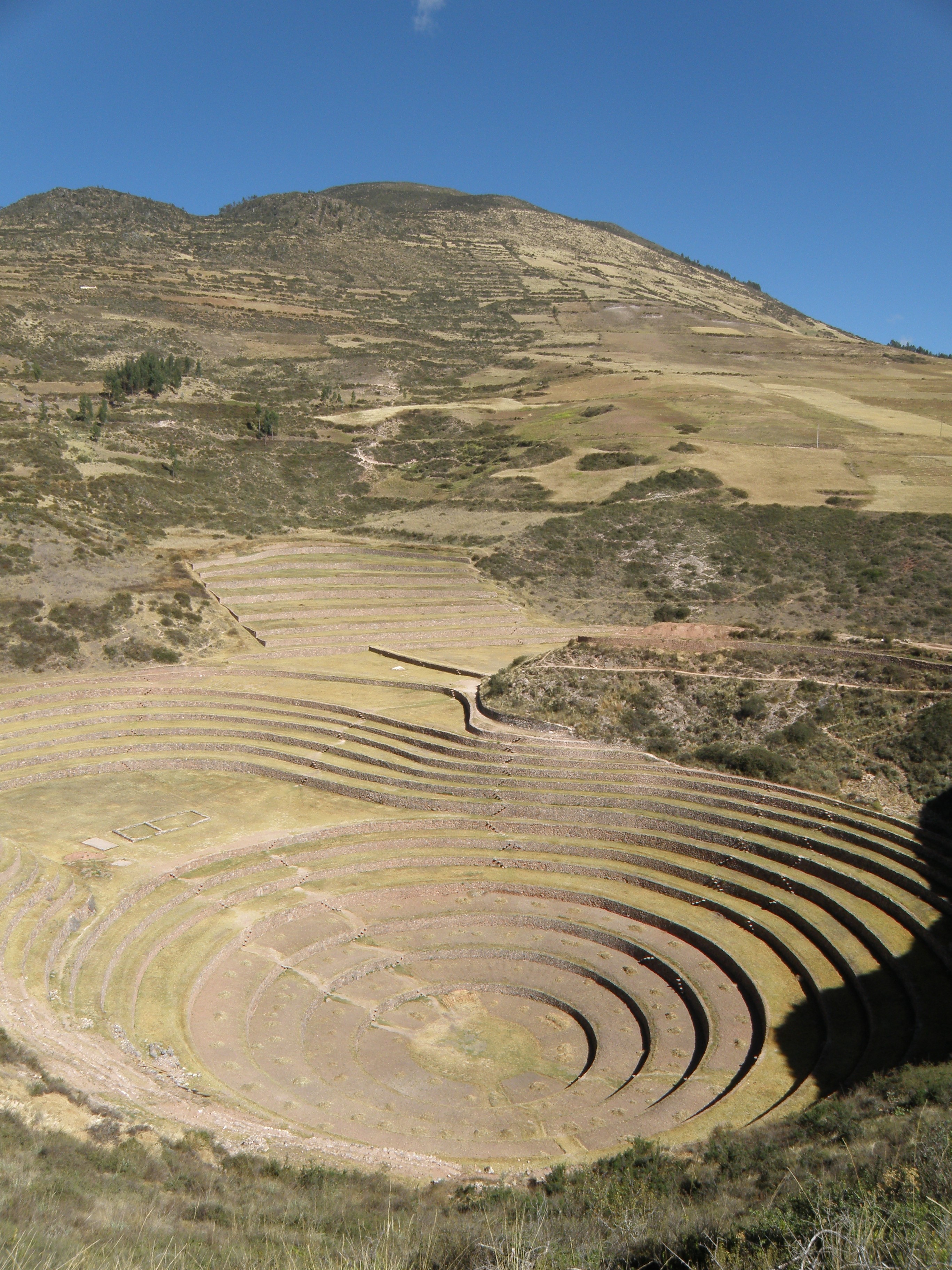 Moray was an ancient, crop circle looking site. It had a microclimate, ideal as a test laboratory for crop growing conditions in Inca times. The most sensible way to get to this remote site, 10 miles west, was to go by taxi. People became stranded there if they weren’t careful. Rosa reminded me about a couple of Brazilians who failed to take a taxi and they spent a perishing night out there in the cold. The day ahead afforded me little time to walk the distance anyway. So, I paid a waiting driver, called Pepe, 25 soles to get me there and back.