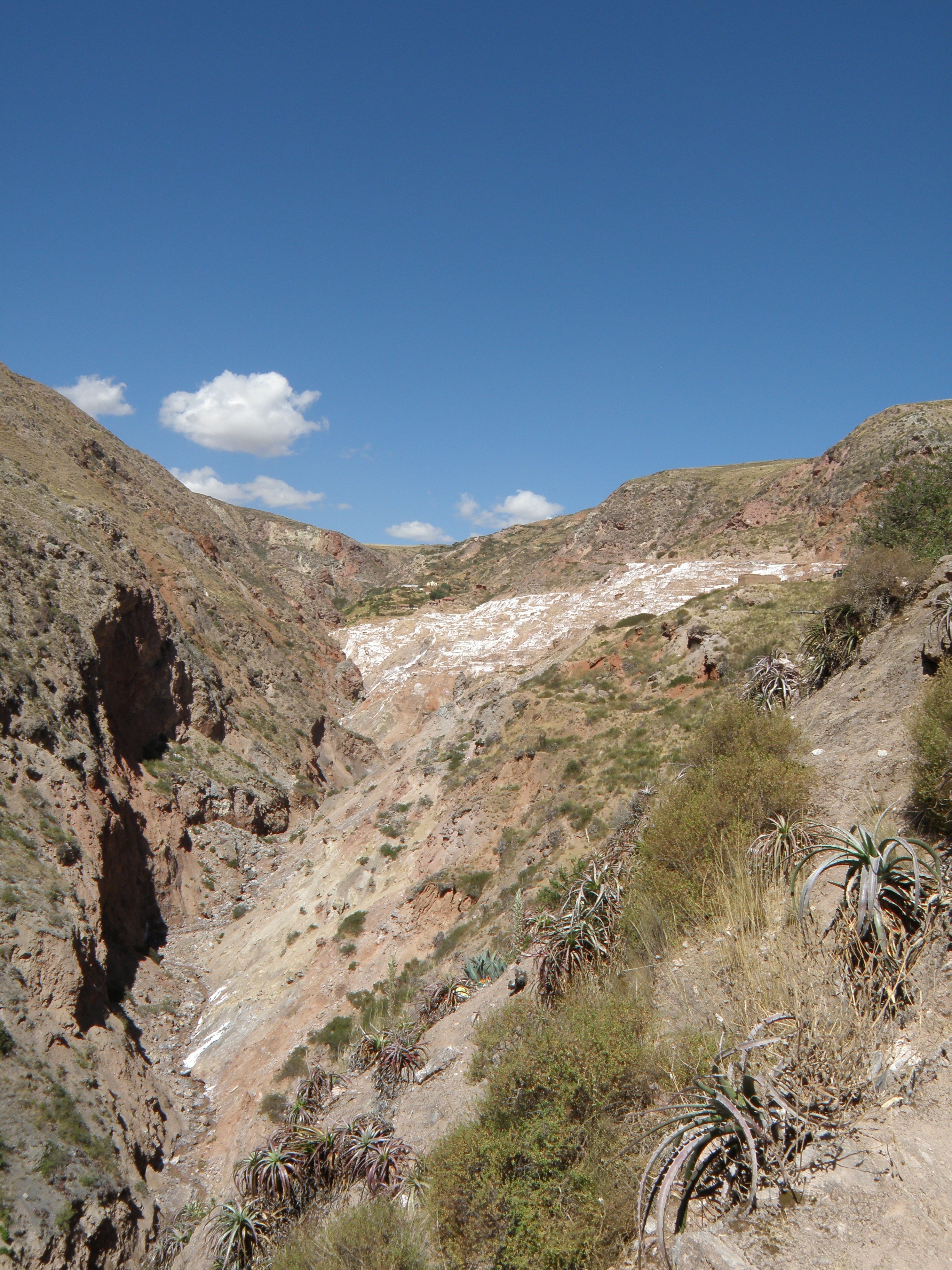 Pepe hailed from these remote parts. He pointed out his school, and old house, where he grew up and learned to read and write. Near to Maras we reached a drop off point for me to walk down the mountain tracks to the Las Salineras de Maras salt pools. Pepe assured me I couldn’t get lost even with my eyes closed, as the white dusty track led straight down to the old salt mine. The downhill distance of 10 kilometres wouldn’t take much more than an hour. From there I’d be just another four kilometres from Urubamba. Under a deep blue sky, I stripped down to my waist and made good distance in a short time.