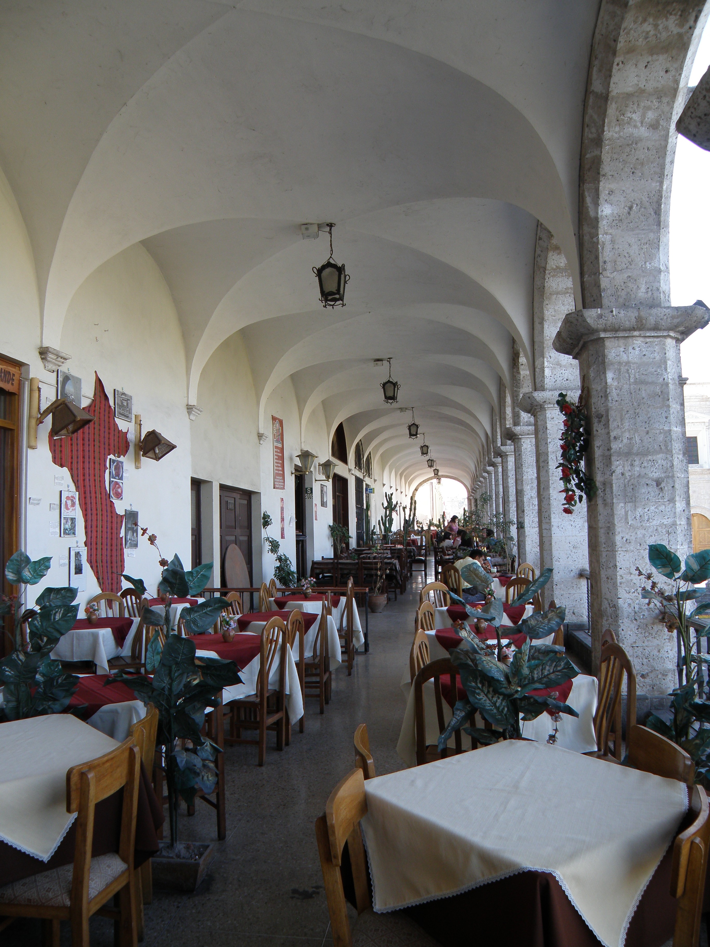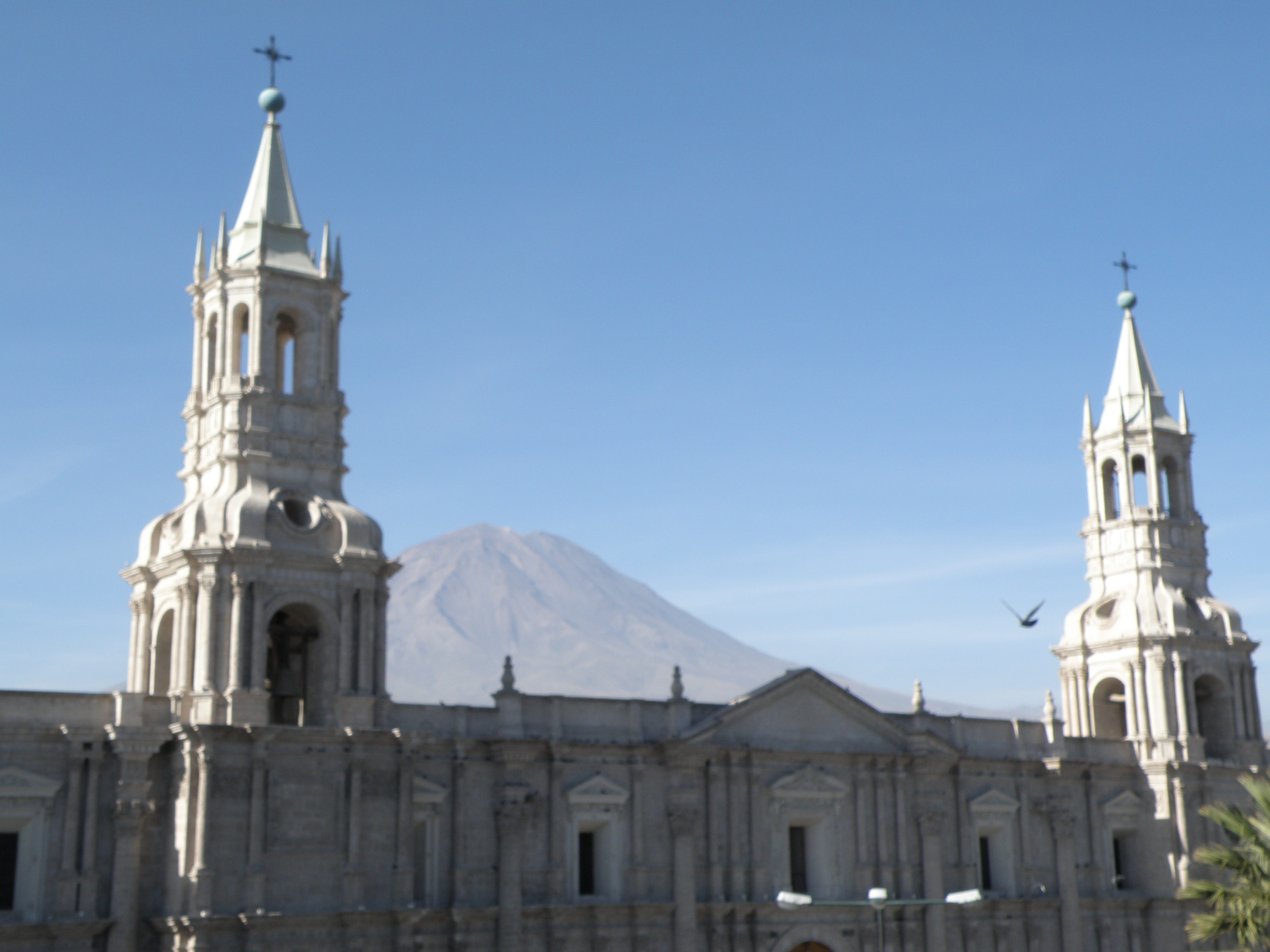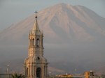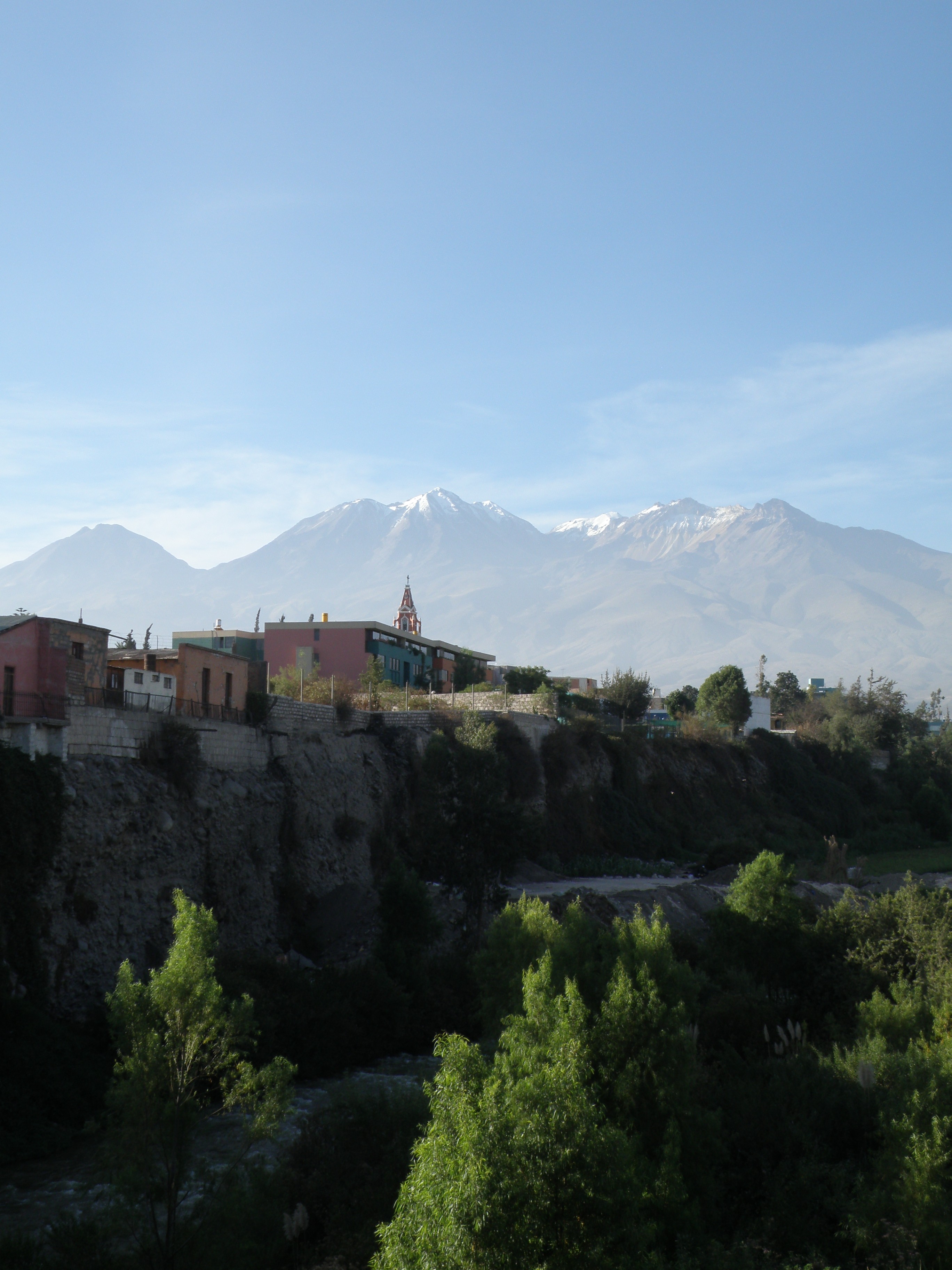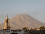 I hadn’t made a reservation, but the Lonely Planet description of Los Andes Bed and Breakfast on La Merced swung it. It was indeed a nice, spacious hotel-like place close to the main plaza. I had the biggest room I’d been in yet at an incredibly cheap 18 soles. The third-floor room overlooked the street and the Plaza de Armas, with a stunning backdrop of the 5,000 metres high El Misti volcano. The room had three beds and came en-suite.