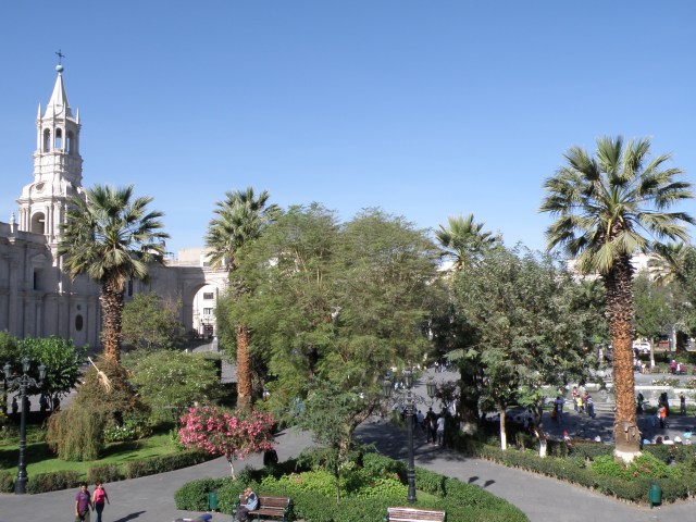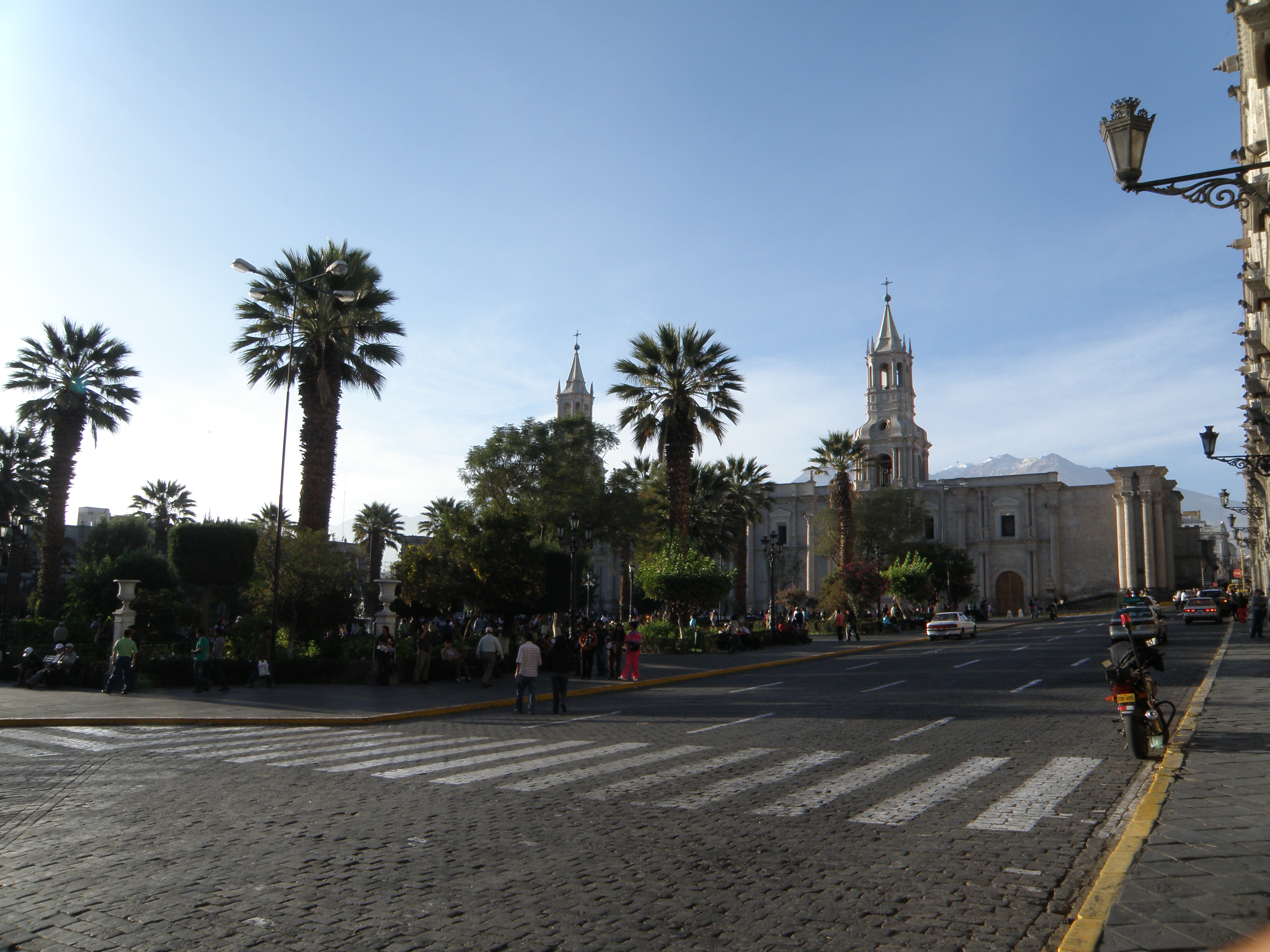 A loud military march was taking place in the Plaza de Armas. The army band’s rapidly beating drums heralded an escalation of volume. Huge gunshots rang out as the midday sun beat down. The sound ricocheted off the splendidly light-coloured volcanic rock (sillar) buildings.