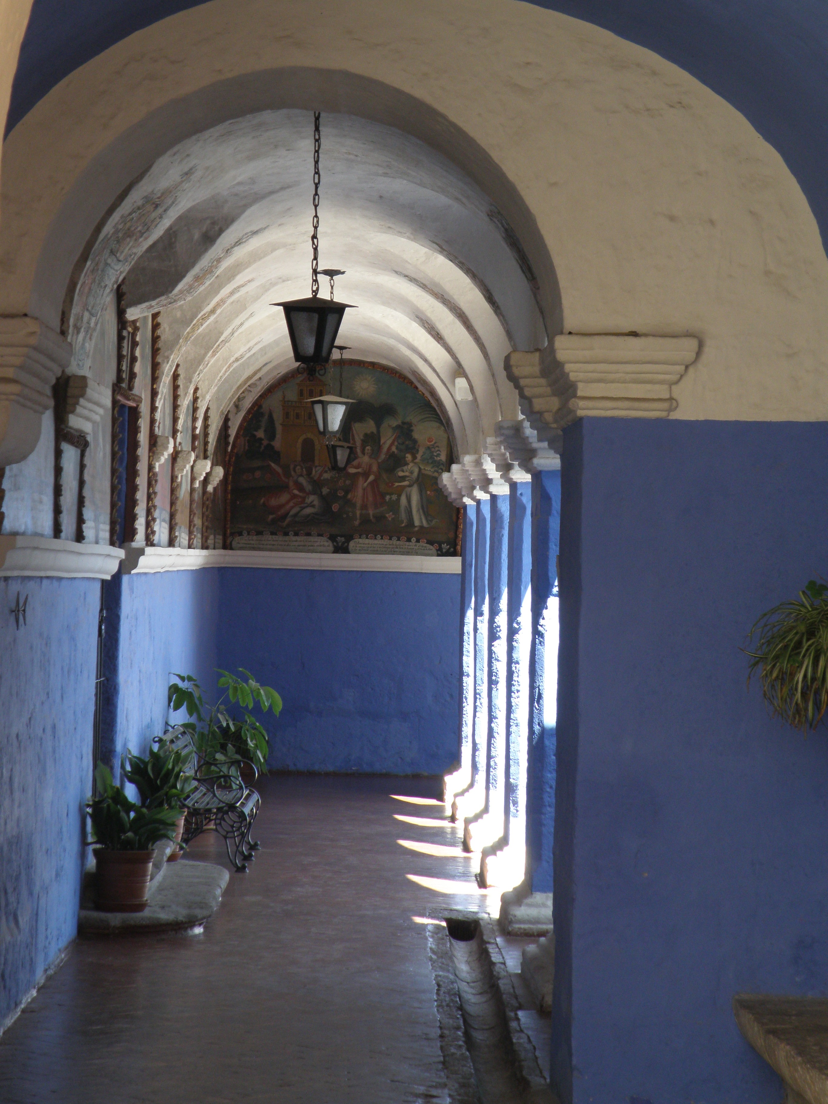 After getting some coins back for two returned bottles of Arequipena beer, I walked down a side street to Casa Del Moral. A 200-year-old mulberry bush graced the inner courtyard and lots of stunning paintings and furniture lined the interior. Then I headed up to Monasterio Santa Catalina. For just 30 soles I remained inside the small city for almost three hours. I declined the guide and avoided the group tours and noise and instead became happily mesmerised by every nook and cranny. The red and blue exteriors of the old structures, the orange trees, the blue walls against the blue sky, the frescos, the galleries, cells and kitchens. All of them sprinkled some old magic in the midday sun. Understandably, there are public access restrictions in the part of the monastery where the nuns still reside.