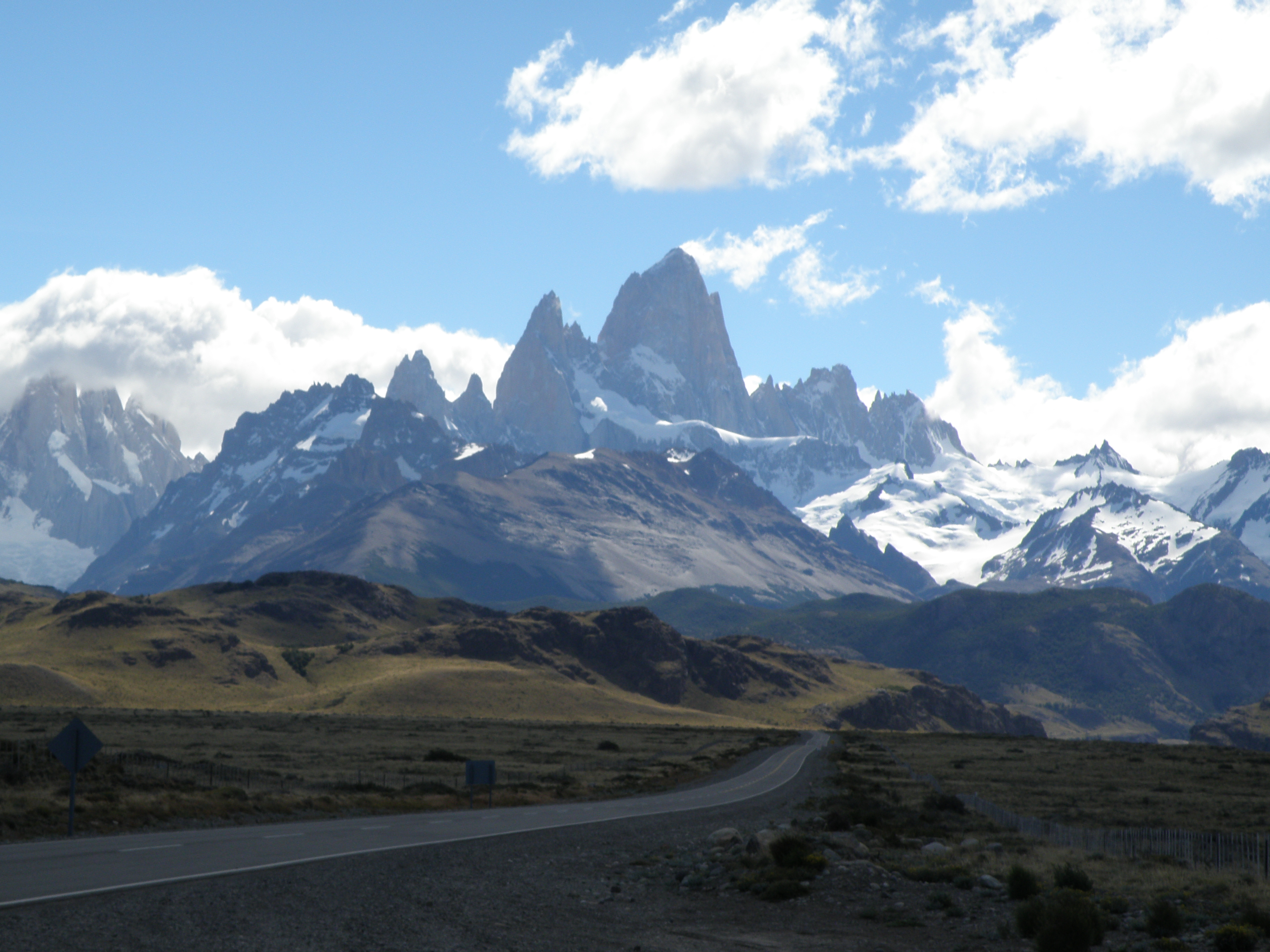 The bus driver dude, sipping his mate tea and sharing it with a young passenger, continually pointed out the majestic Cerro Fitzroy summit we were travelling in the direction of. Fitzroy’s huge throne-like slab of grey rock spectacularly soared out of its icy base to a height of 3,441 metres in the western, blue sky. Motoring along Route 40, made famous by the young Che Guevara in his motorcycle adventures, brought us to a stop point to admire the towering peaks. Meanwhile, radio reports on the bus kept mentioning the Malvinas row over British oil drilling activities. Apparently it was starting to dominate the news and I felt uneasy about it for the first time. However, taking the Fitzroy backdrop photos, just before our arrival in El Chalten, I felt a welcoming nature’s embrace in this stunning location.