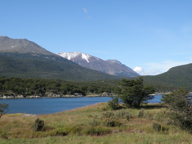 After the clerk kindly escorted me to the ATMs at the other side of the building, I laughed, withdrew some cash and wandered off for a big grill meal then ventured to the harbour to find a bus to take me west into the Parque Nacional Tierra del Fuego (Tierra del Fuego National Park). I paid the 20 pesos entry fee and the Peruvian driver took me further into the park where I could start a sun-drenched hike in the stunning scenery of late summer colour with purple heather gracing the lower hills overlooking the blue lakes and pine forests. High-teen temperatures graced this lovely day and I marvelled at the idyllic locations for camping out. It was a landscape to paint on canvas, and to enjoy under canvas!