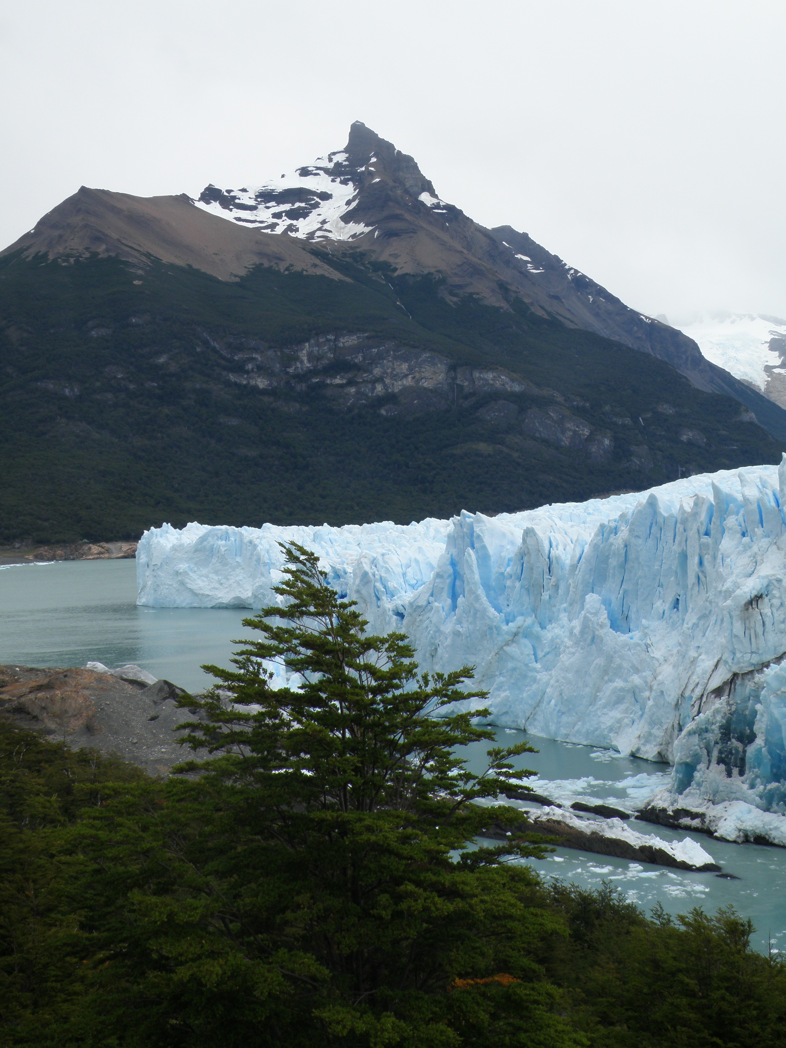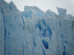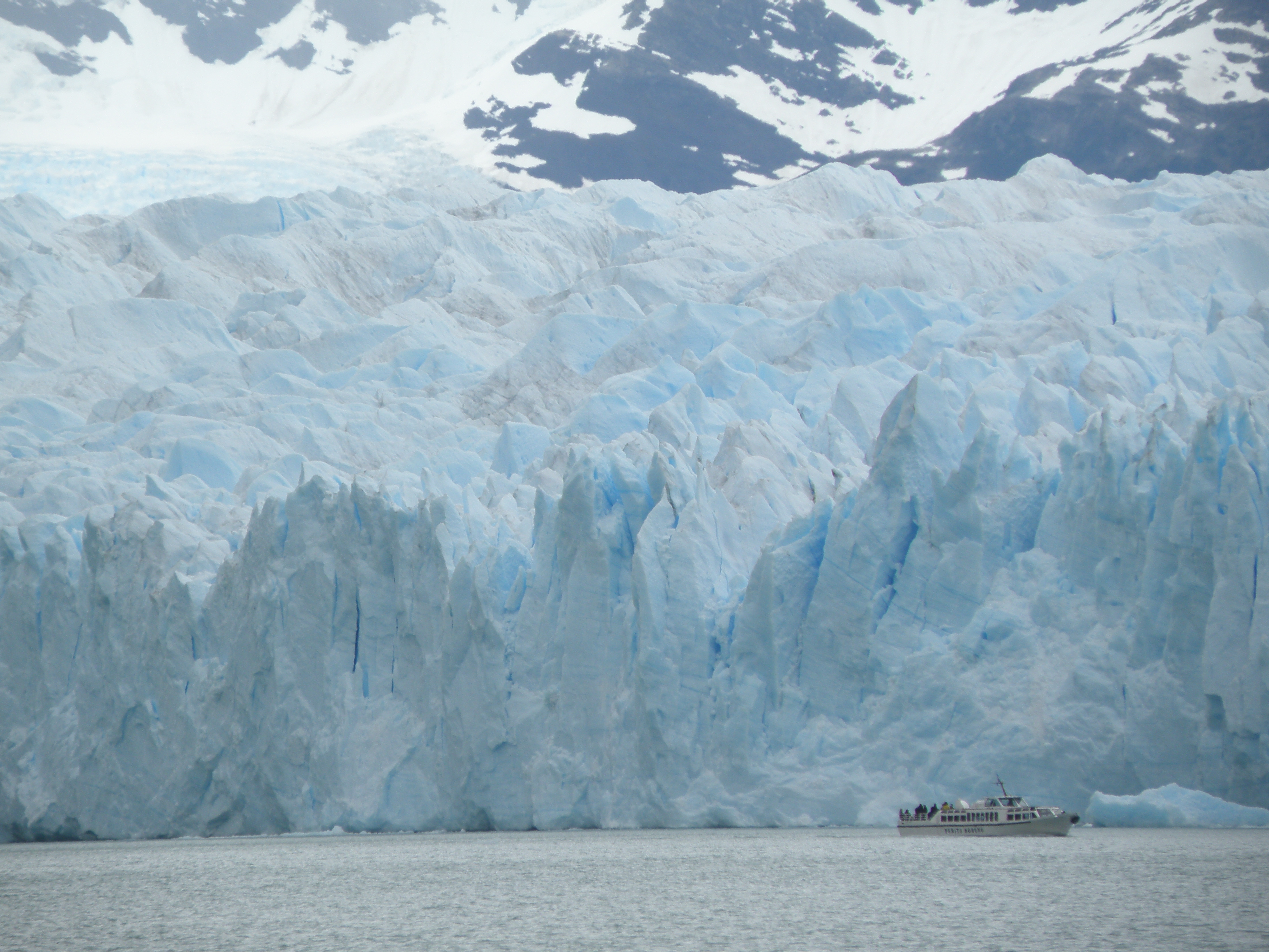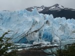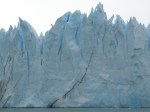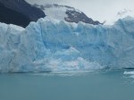 On my first excursion into the Andes I enjoyed a spectacular visit up to the Perito Moreno glacier, a stunning sight. I went along with the others on our minibus. We were entertained by some great folk music being played by the driver on his CD player. I relished this mind-blowing afternoon, especially the boat trip right up close to the glacier wall, a unique and rare chance to witness nature’s glory. There was a 75 pesos charge to enter the Parque Nacionales Los Glaciares. However, the different balcony views of an amazing glacier were later surpassed by our boat’s close flirtation with the steep-sided ice bulk’s blue-tinted fissures pointing high up into the mist. The milky coloured water from the ice melt induced a cold sensation in me as we floated next to one of the few stable and advancing (two metres a day) glaciers left in the world. The mass sheet was cracking up on its north side, but the advancing colder season would soon see it blocking up the river again. Some spectacular ice breaks occurred with corresponding cracks and groans as we all gasped at this marvellous beauty.